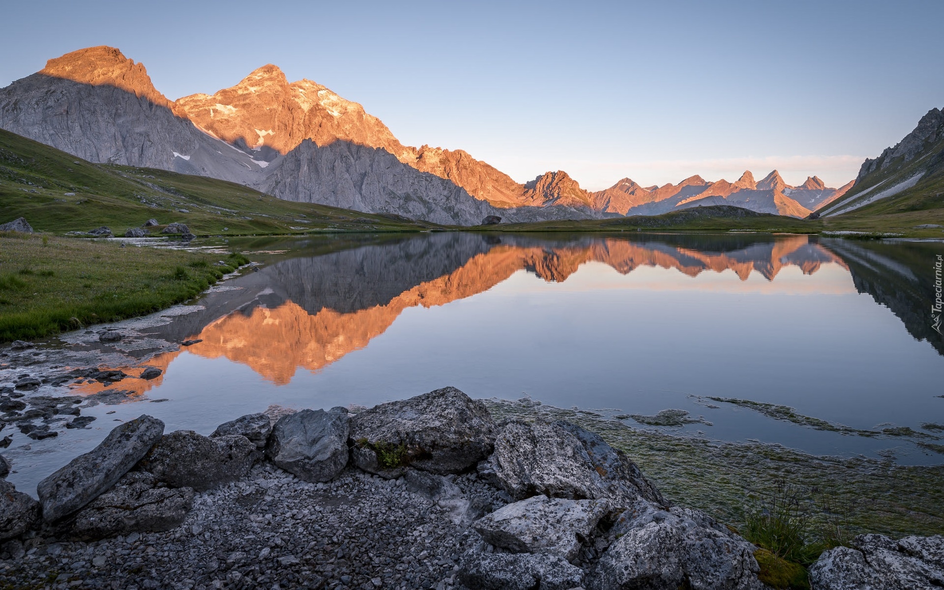Edytor tapety: Odbicie rozświetlonych gór w jeziorze Lac des Cerces
