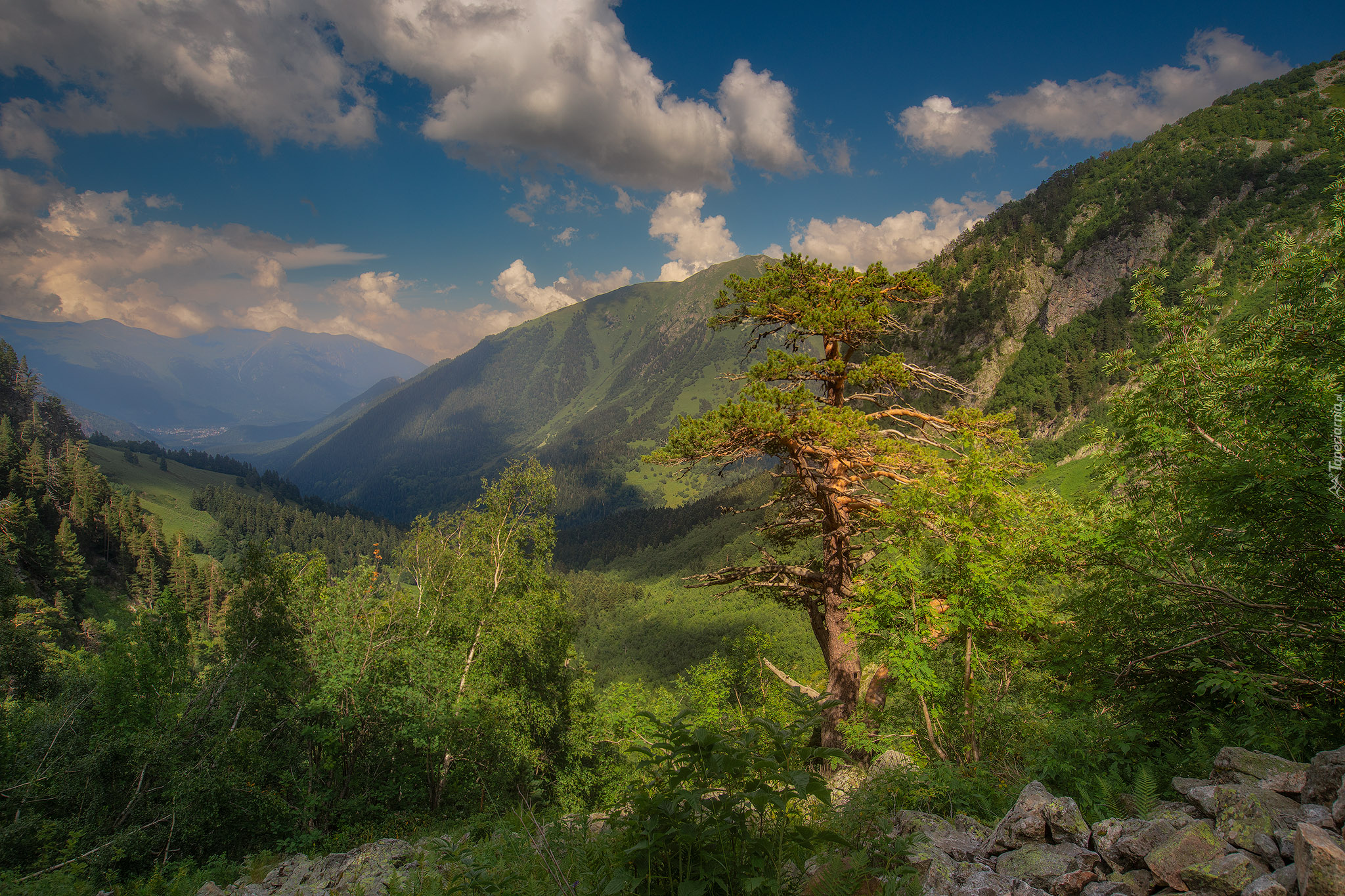 Edytor tapety: Rozświetlone drzewa w górskiej dolinie