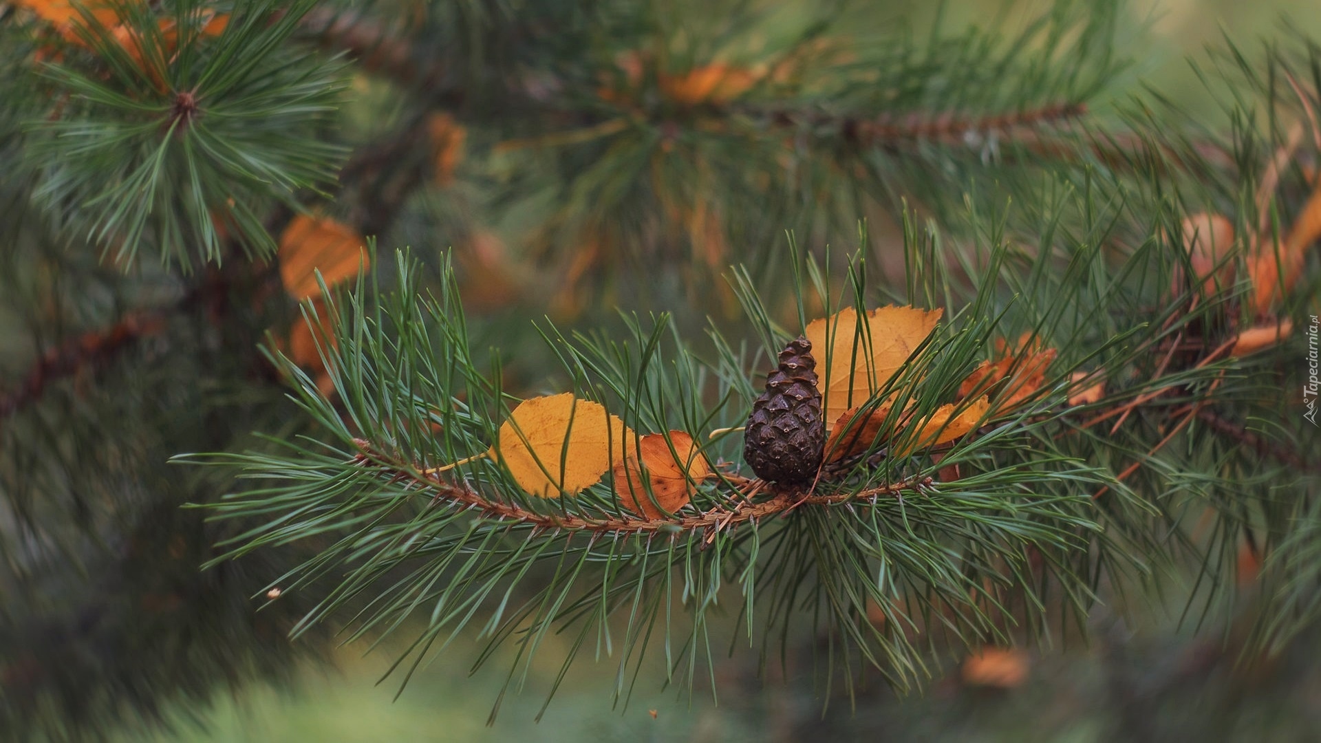 Edytor tapety: Szyszka i jesienne liście na gałązce sosny
