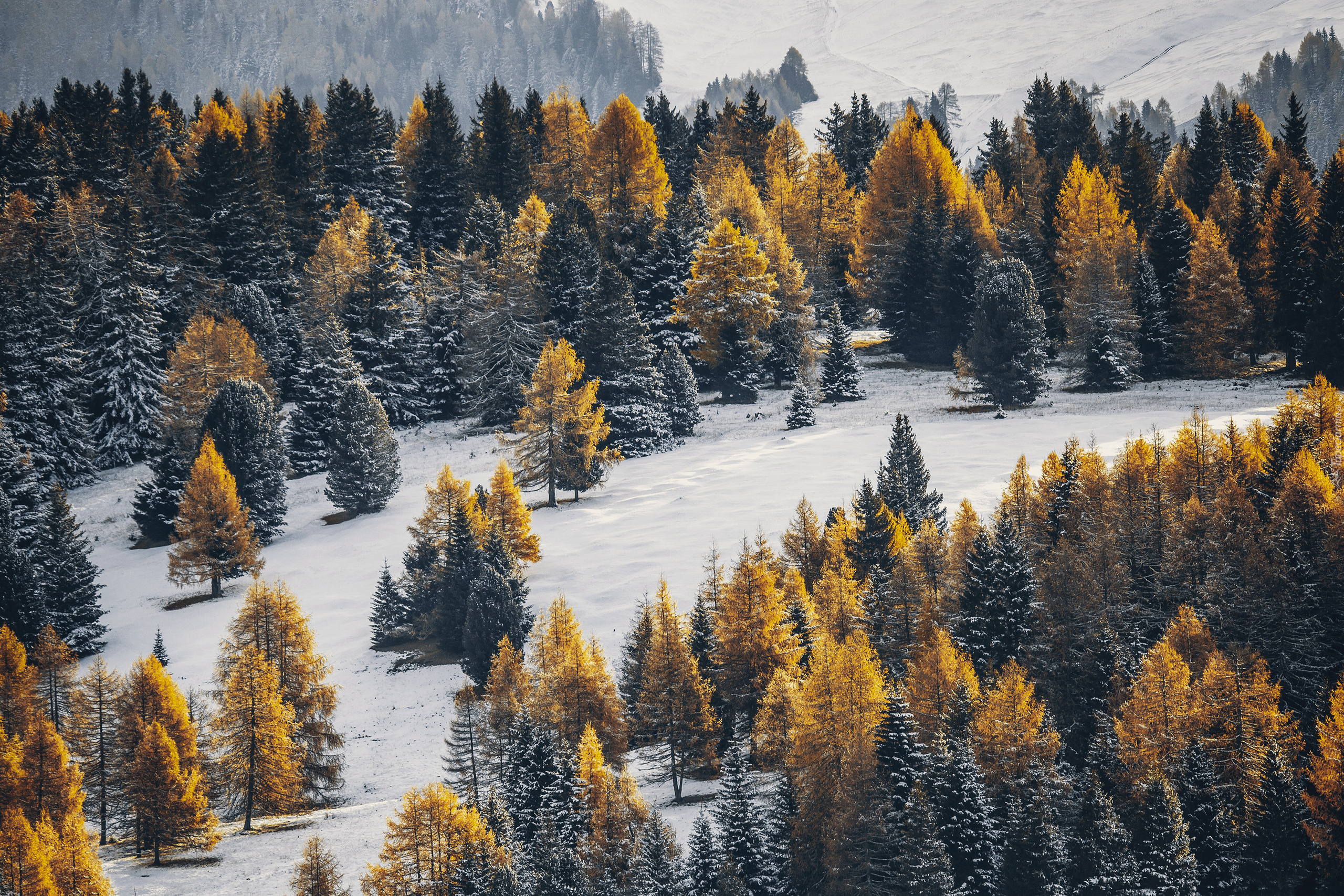 Edytor tapety: Ośnieżone pożółkłe modrzewie i sosny na wzgórzu