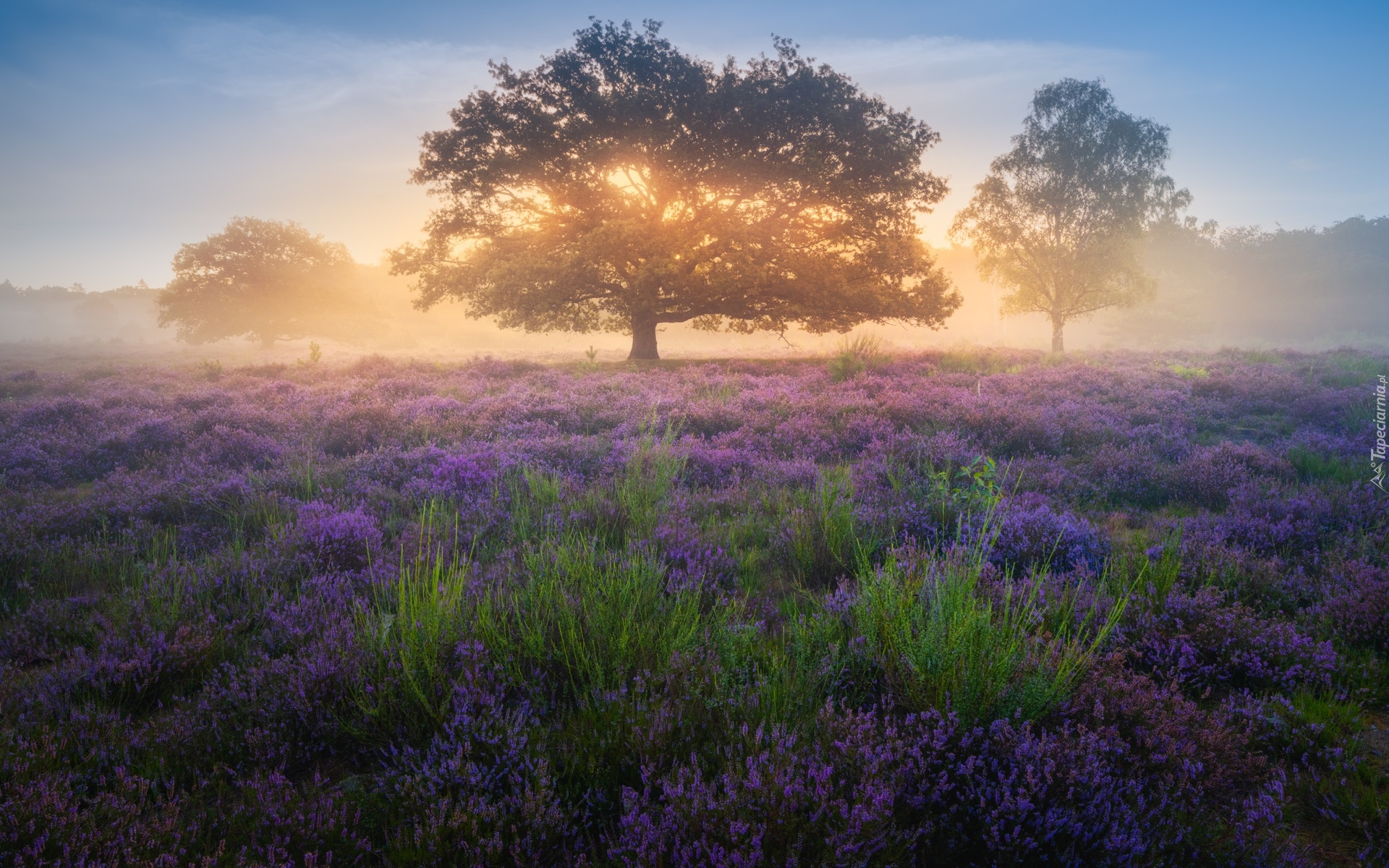 Edytor tapety: Drzewa na zamglonym wrzosowisku o wschodzie słońca