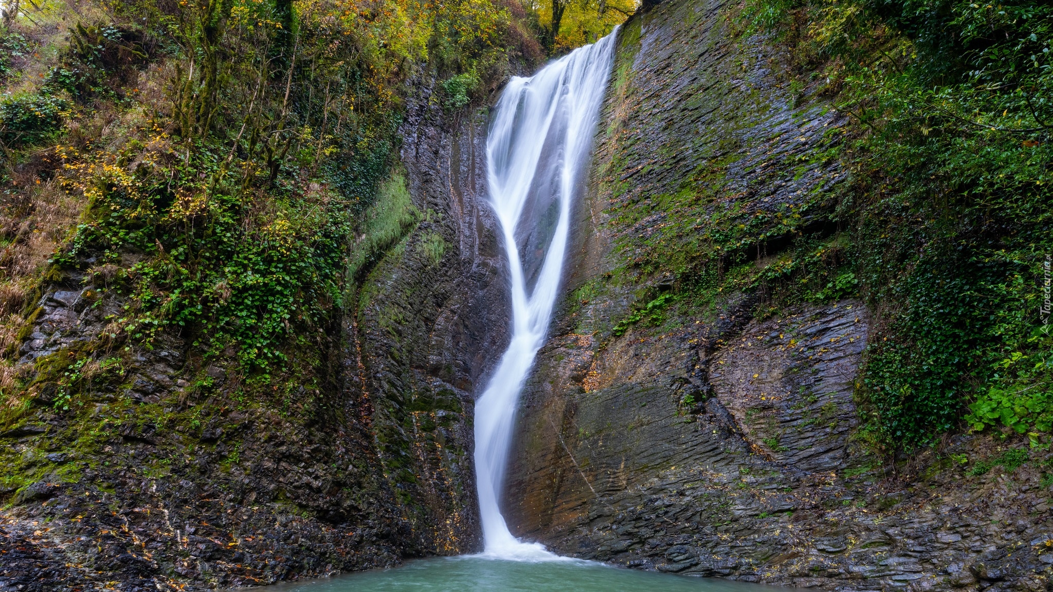 Edytor tapety: Wodospad Orekhovsky spływający po skałach do rzeki Bezumenka