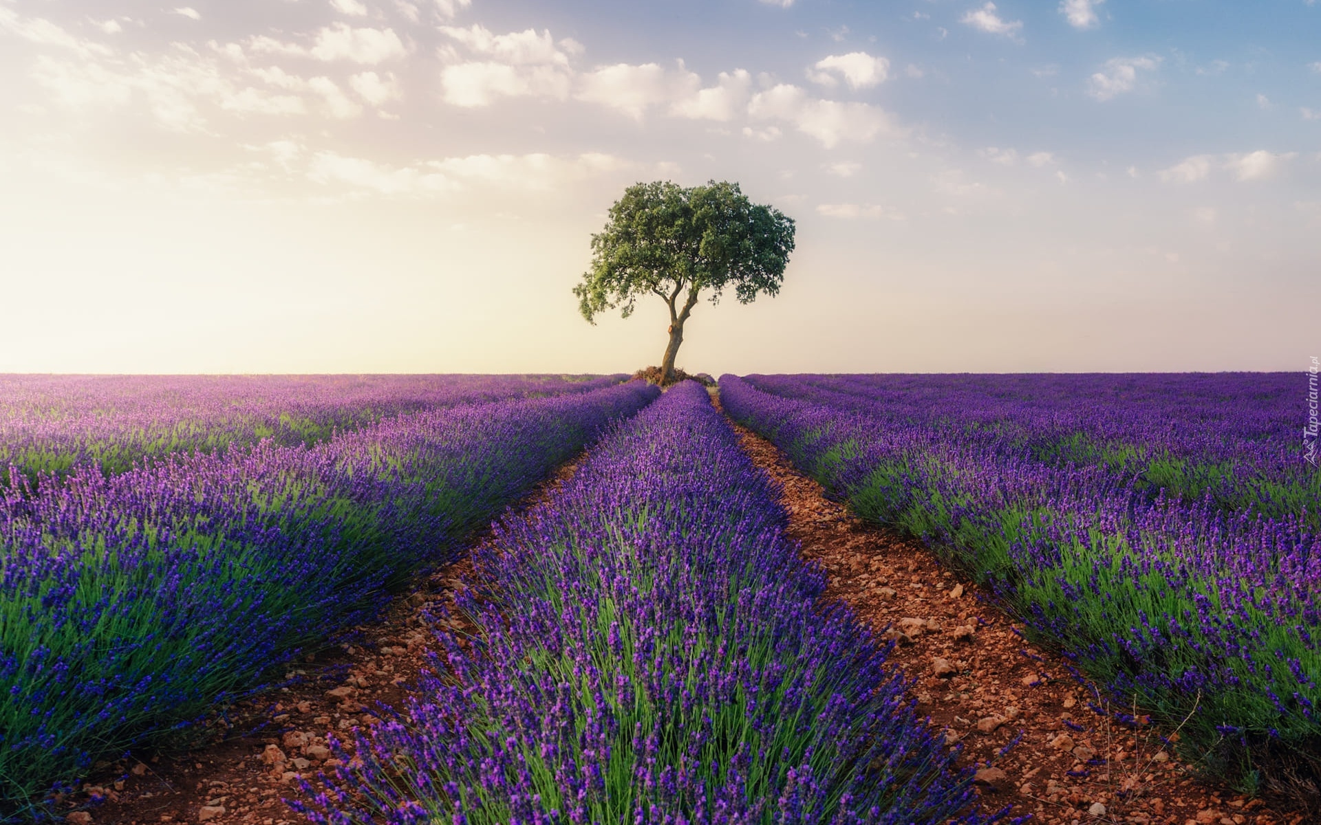 Edytor tapety: Pole lawendy i samotne drzewo