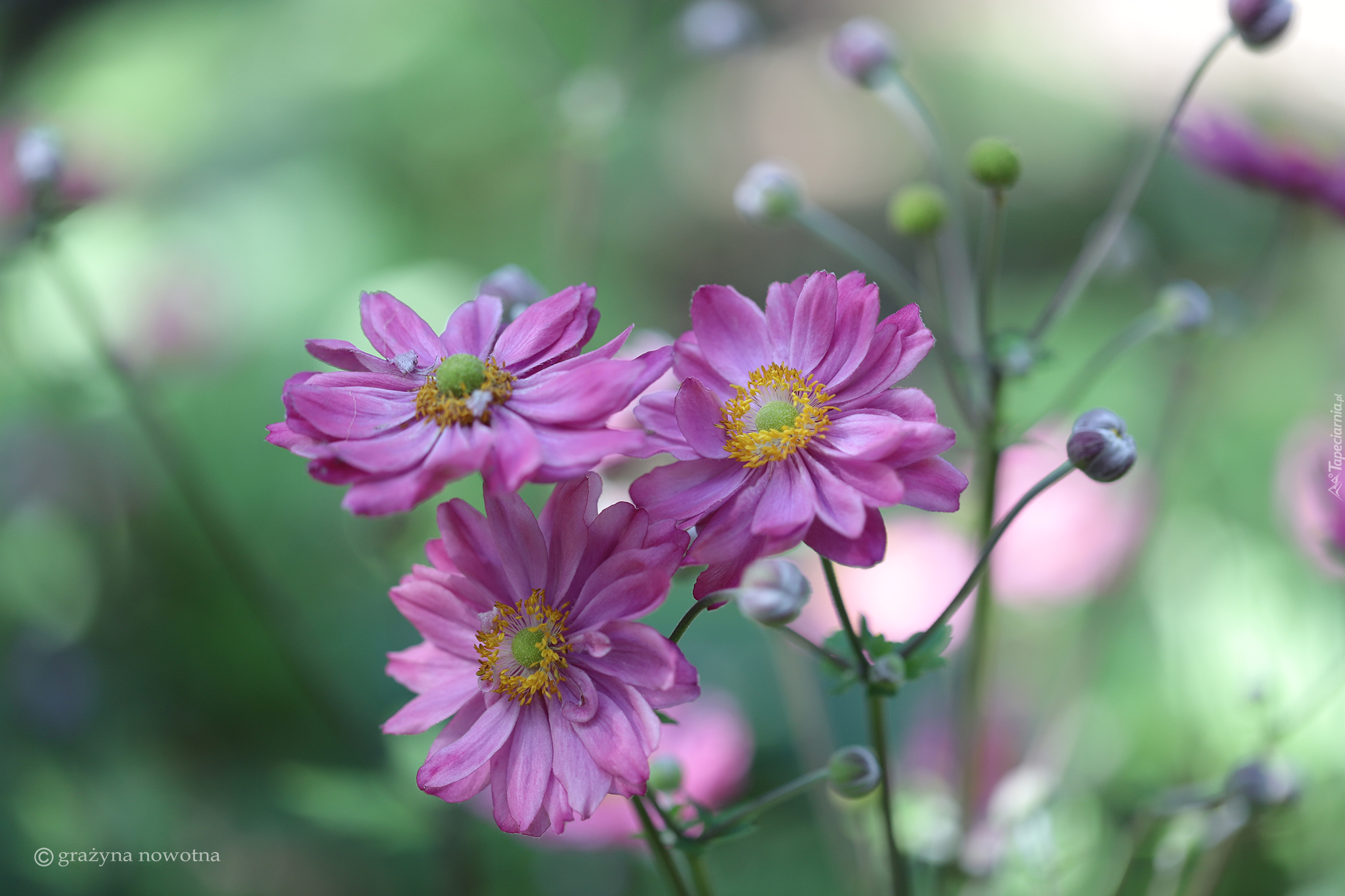 Edytor tapety: Różowy zawilec z pąkami na rozmytym tle