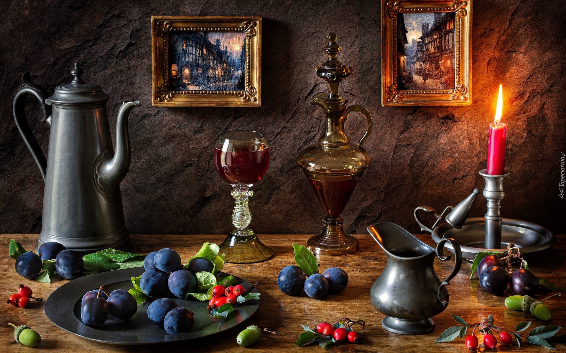 Edytor tapety: Karafka i kieliszek obok świecy dzbanka i śliwek
