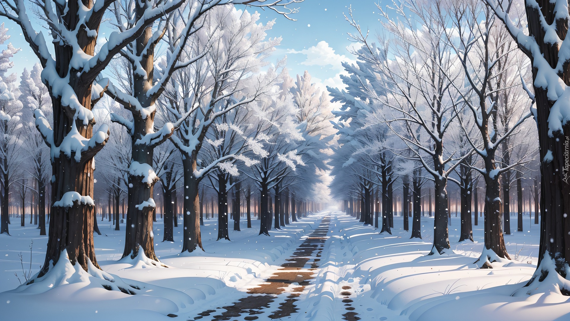 Edytor tapety: Rozświetlone ośnieżone drzewa przy leśnej drodze w 2D