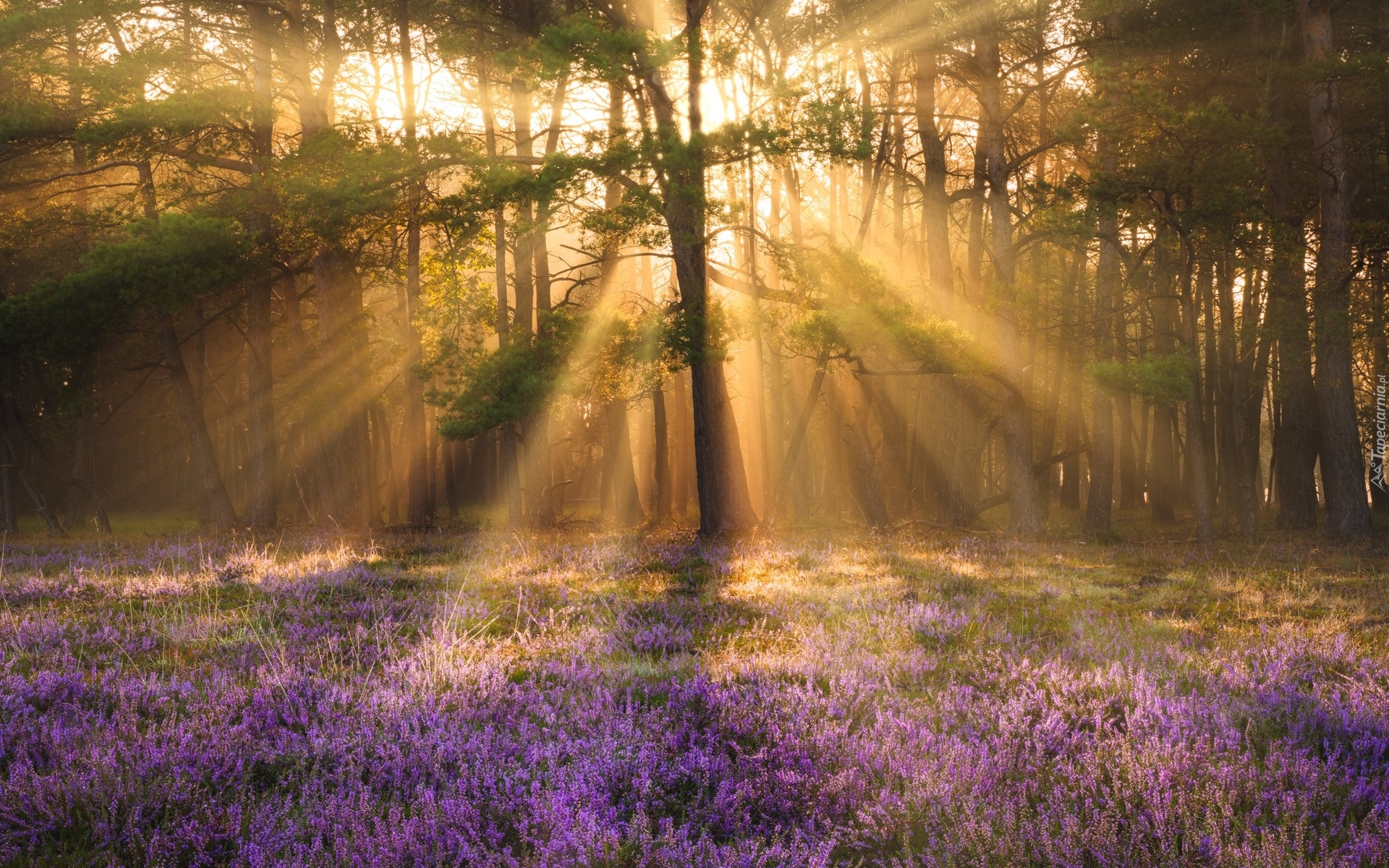 Edytor tapety: Rozświetlone promieniami słońca wrzosy na leśnej polanie