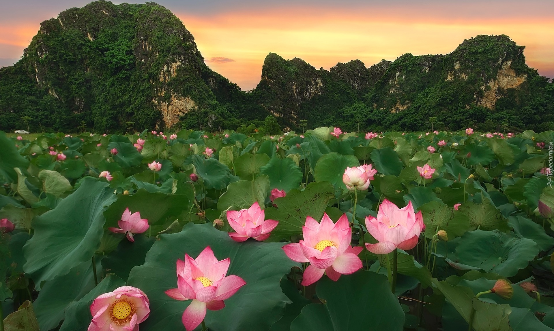Edytor tapety: Różowe lotosy z liśćmi na tle gór