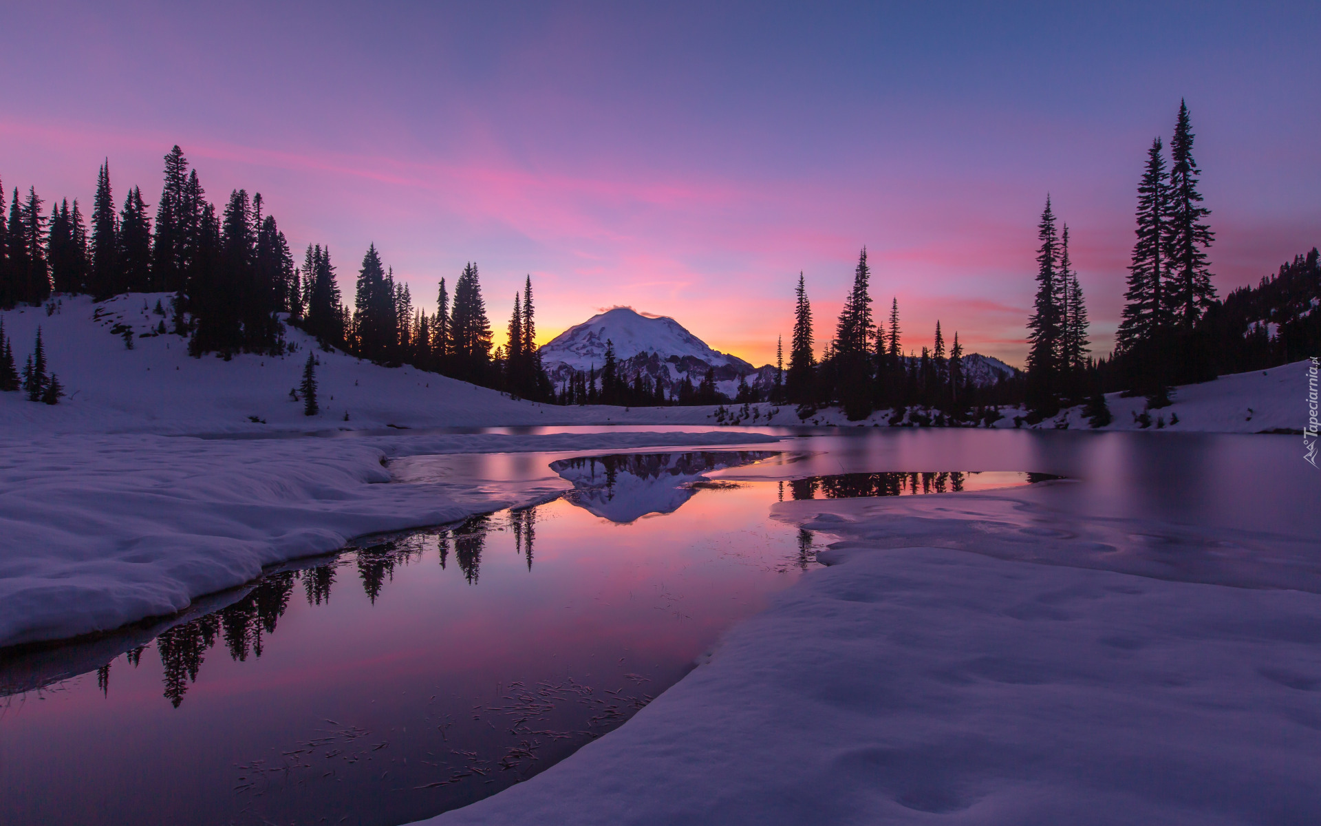 Edytor tapety: Kolorowe niebo zachodzącego słońca nad ośnieżoną górą