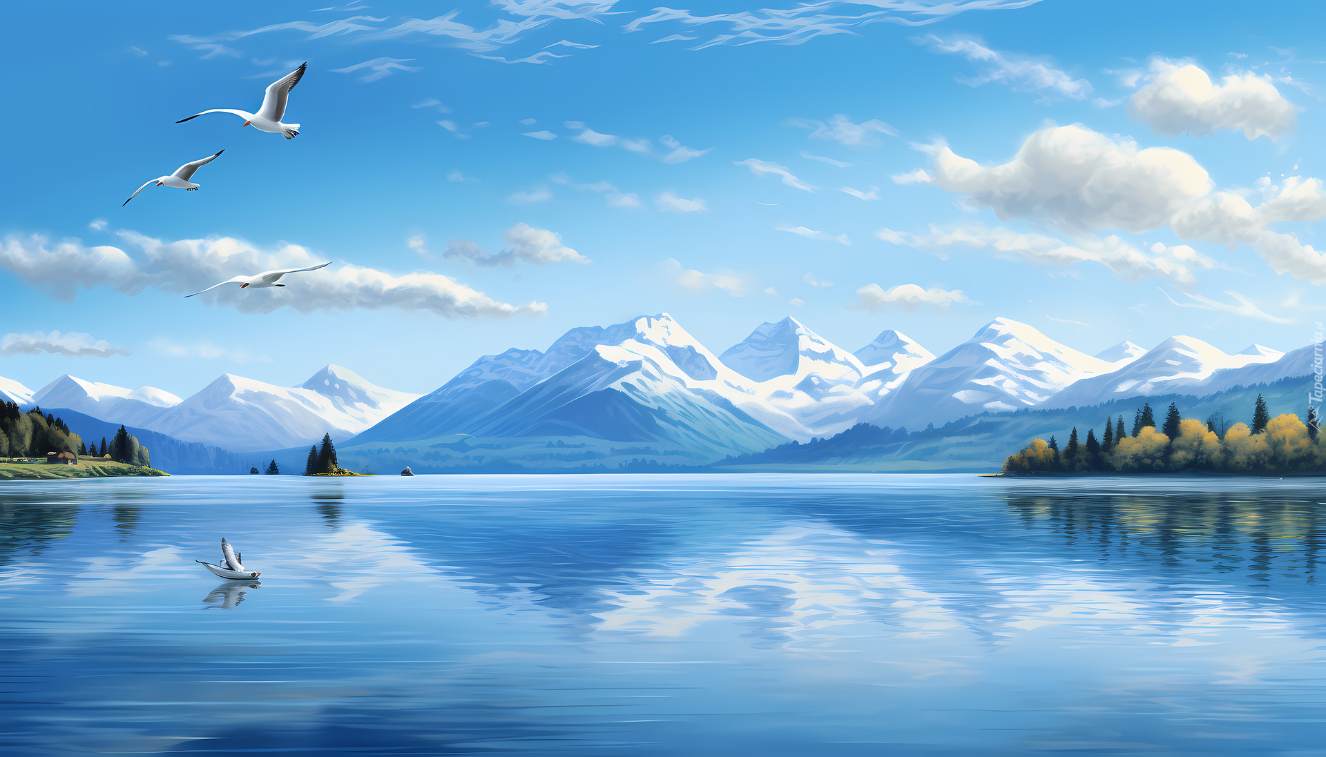 Edytor tapety: Mewy nad morzem w górach w grafice