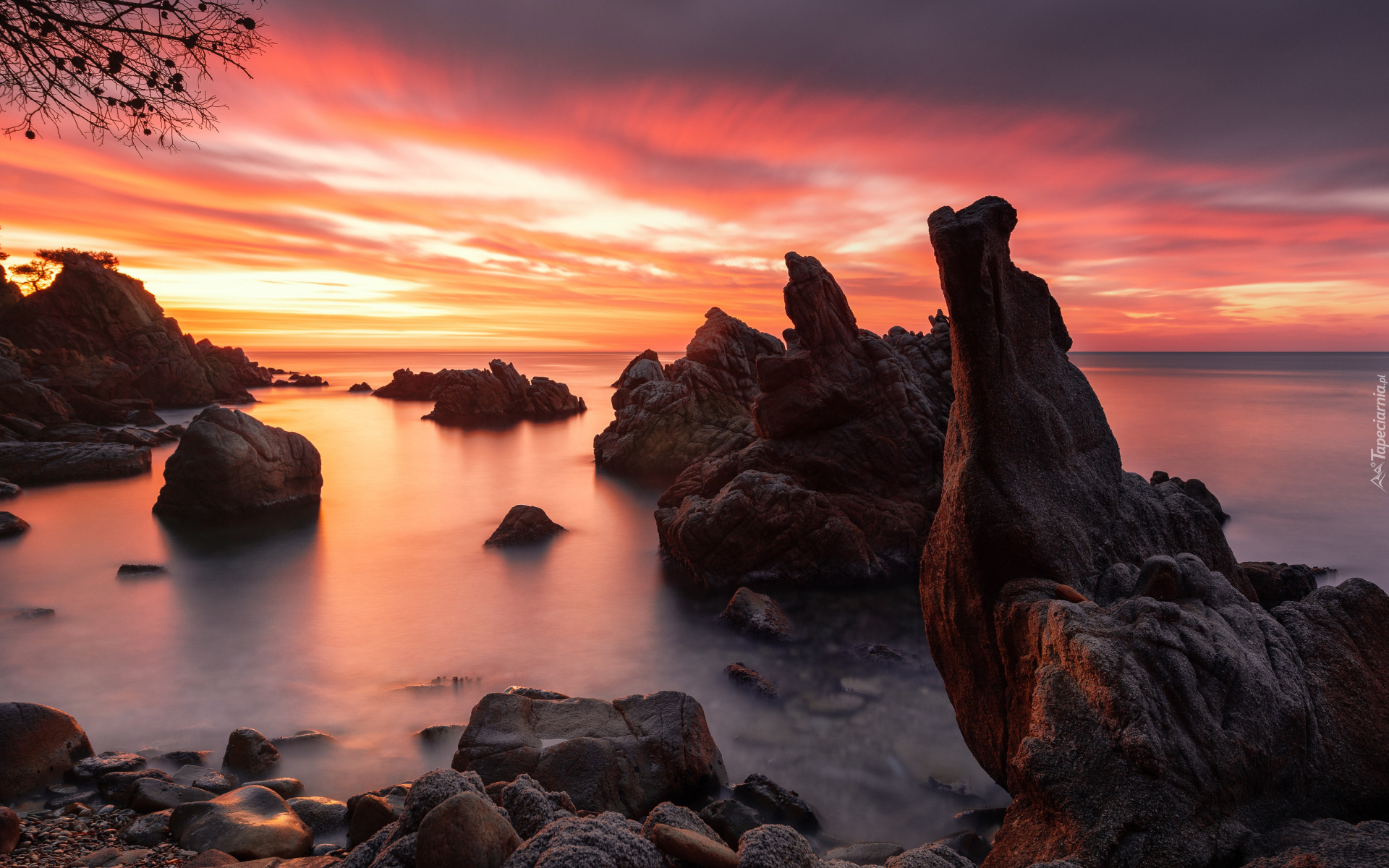 Edytor tapety: Skały na brzegu morza o zachodzie słońca