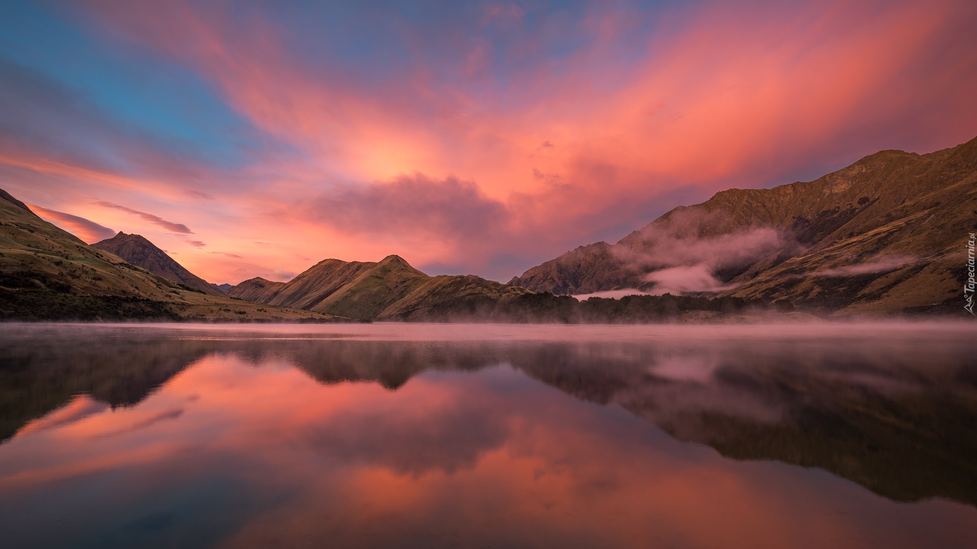 Edytor tapety: Kolorowe niebo i mgła nad górskim jeziorem