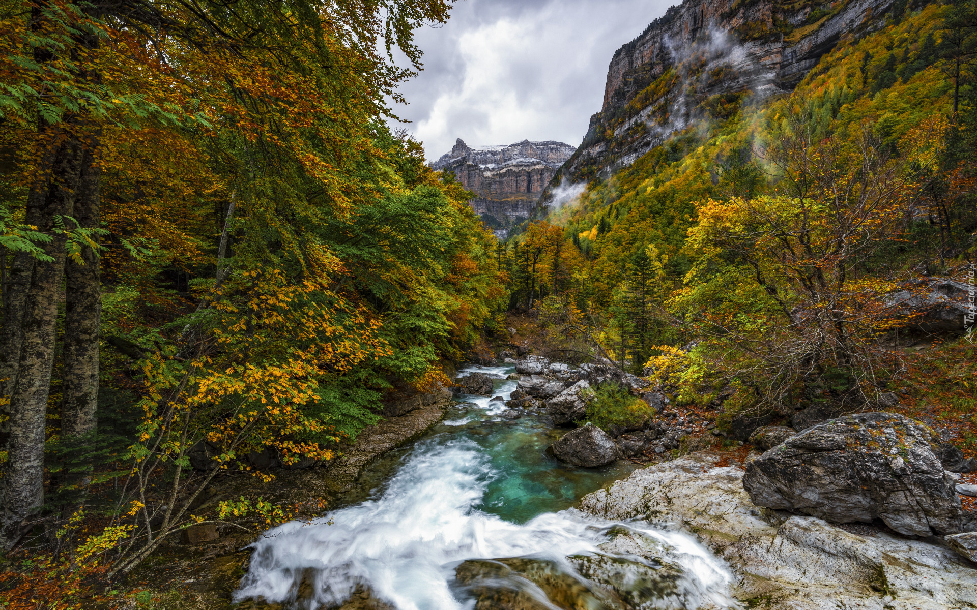 Edytor tapety: Drzewa i kamienista rzeka w górskim wąwozie