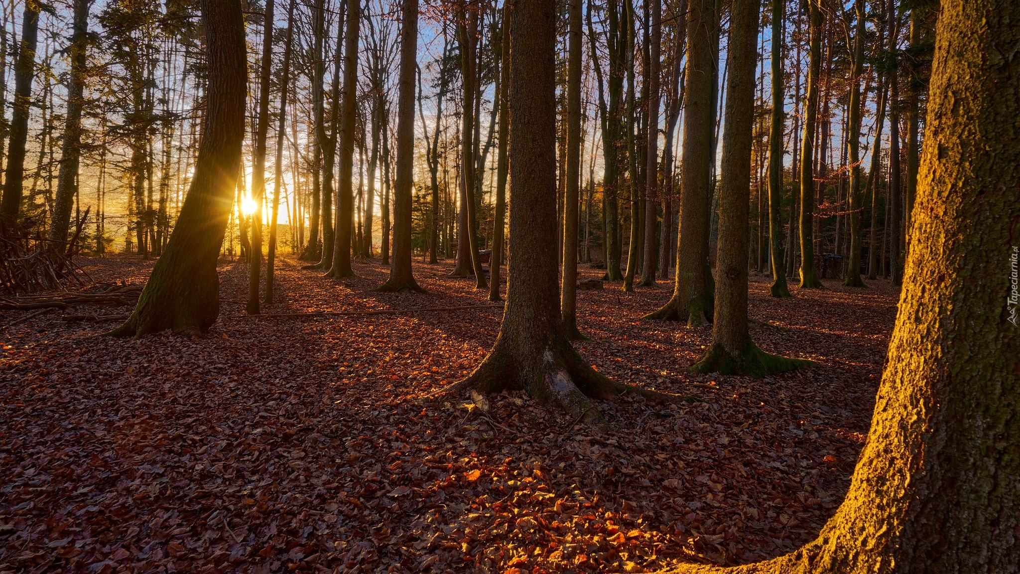Edytor tapety: Rozświetlone opadłe liście pod drzewami w lesie