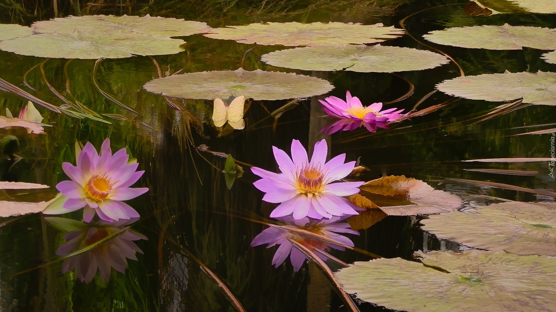 Edytor tapety: Trzy różowe lilie wodne i liście na wodzie