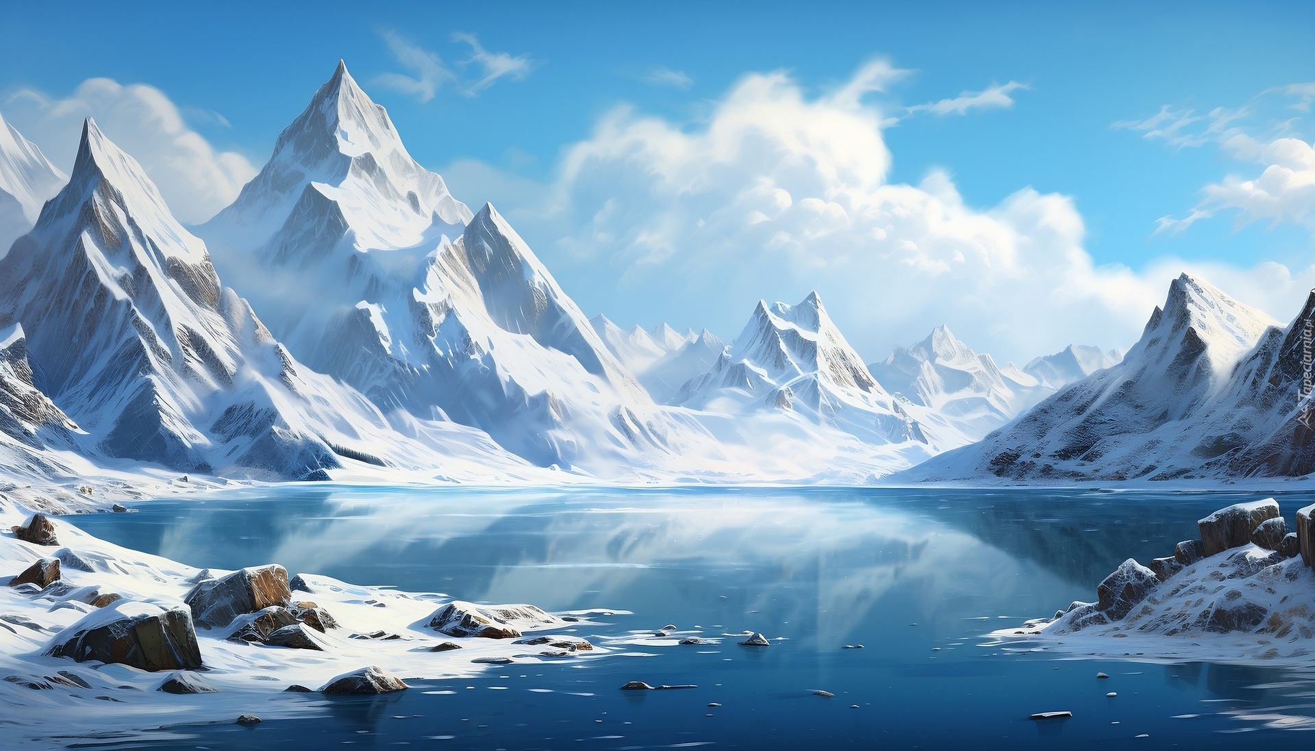 Edytor tapety: Jezioro w ośnieżonych górach w grafice