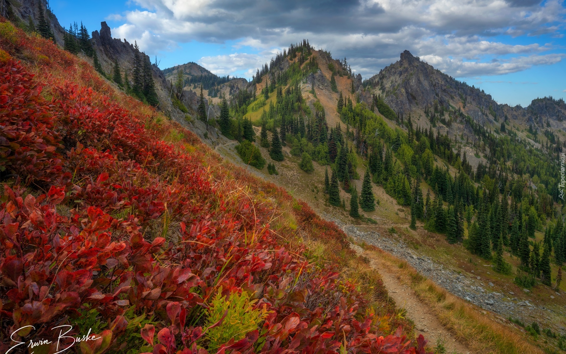 Edytor tapety: Kolorowa roślinność i drzewa na górach pod chmurami