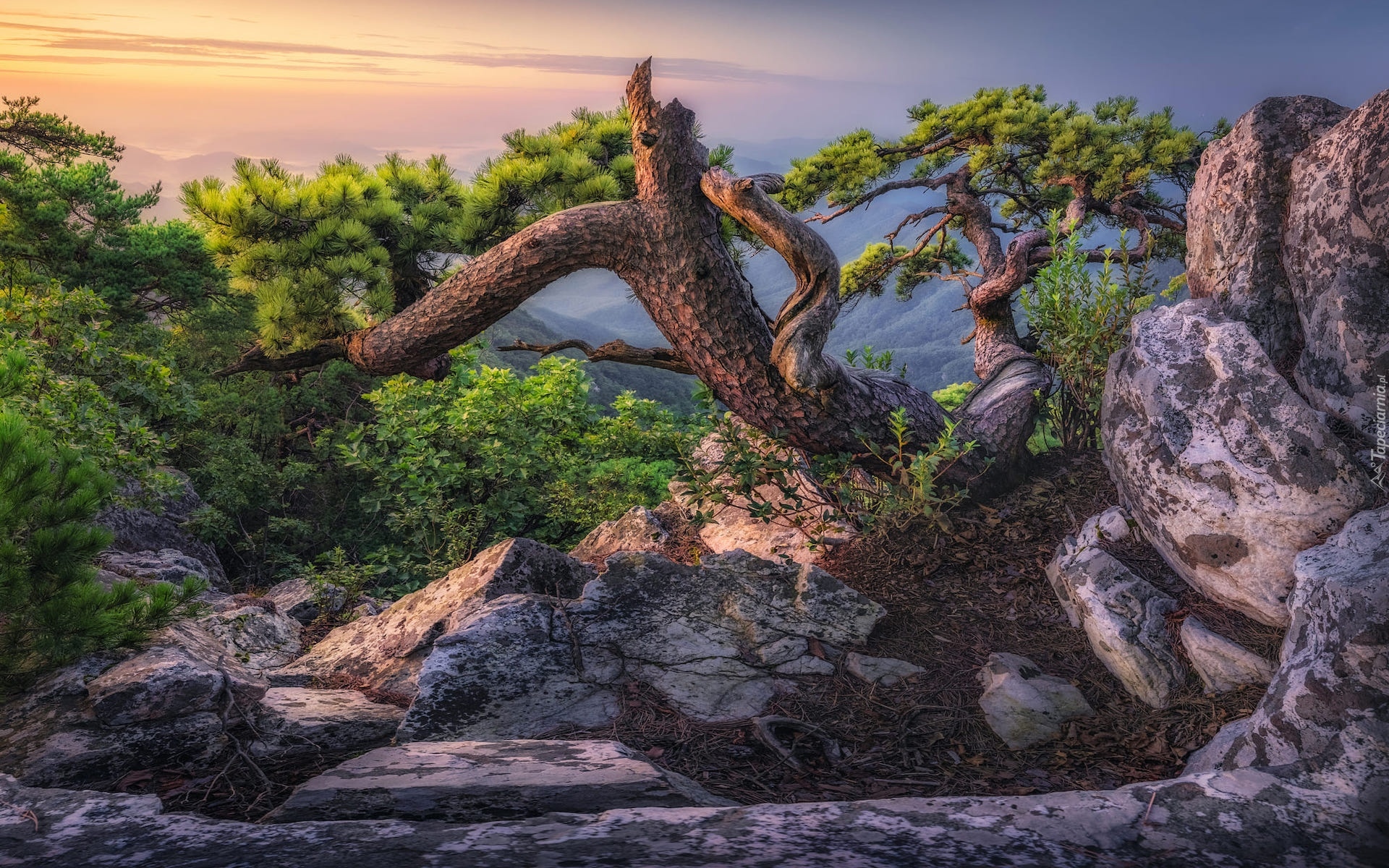 Edytor tapety: Rozświetlona sosna na skałach