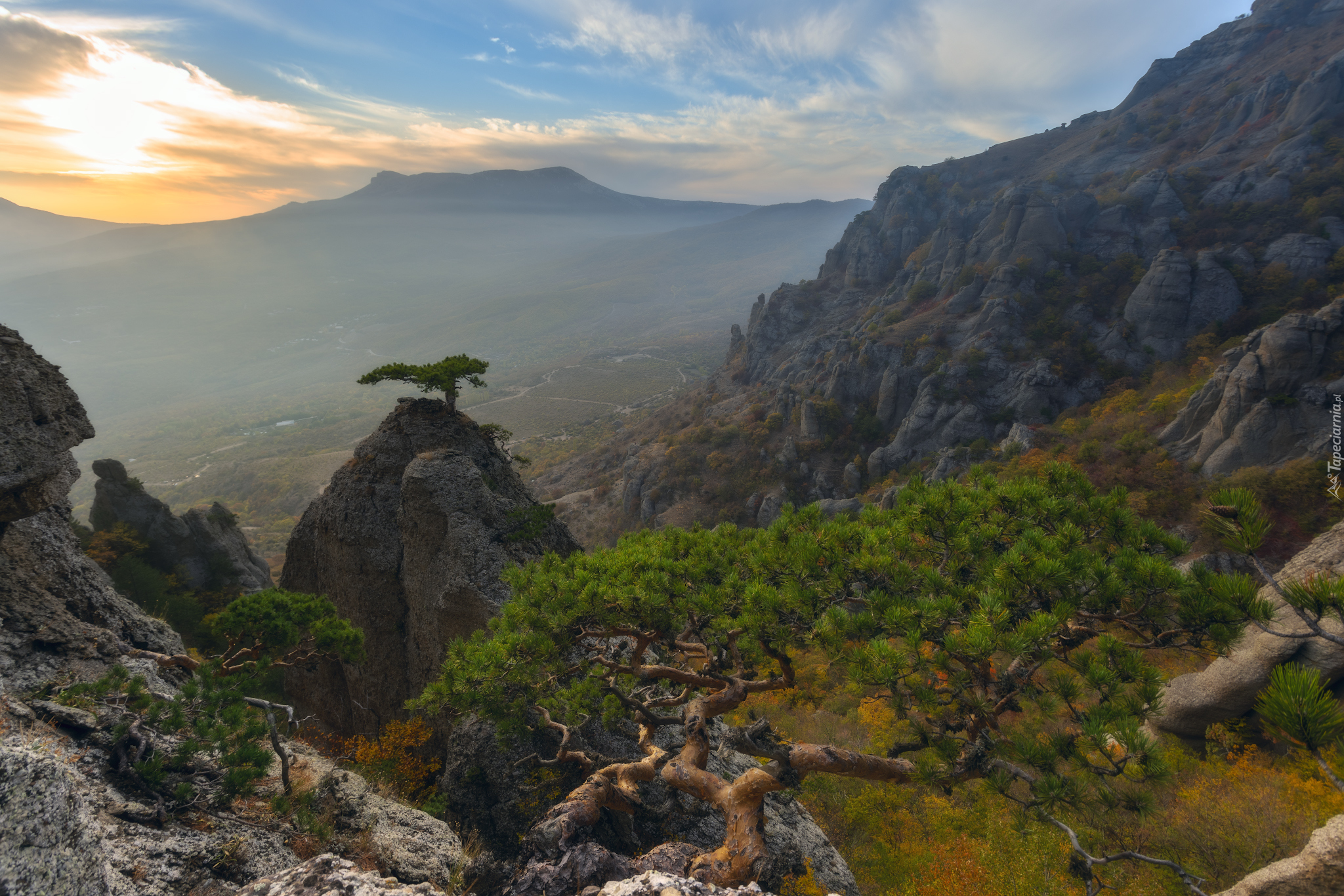 Edytor tapety: Sosny na skałach i Góry Krymskie