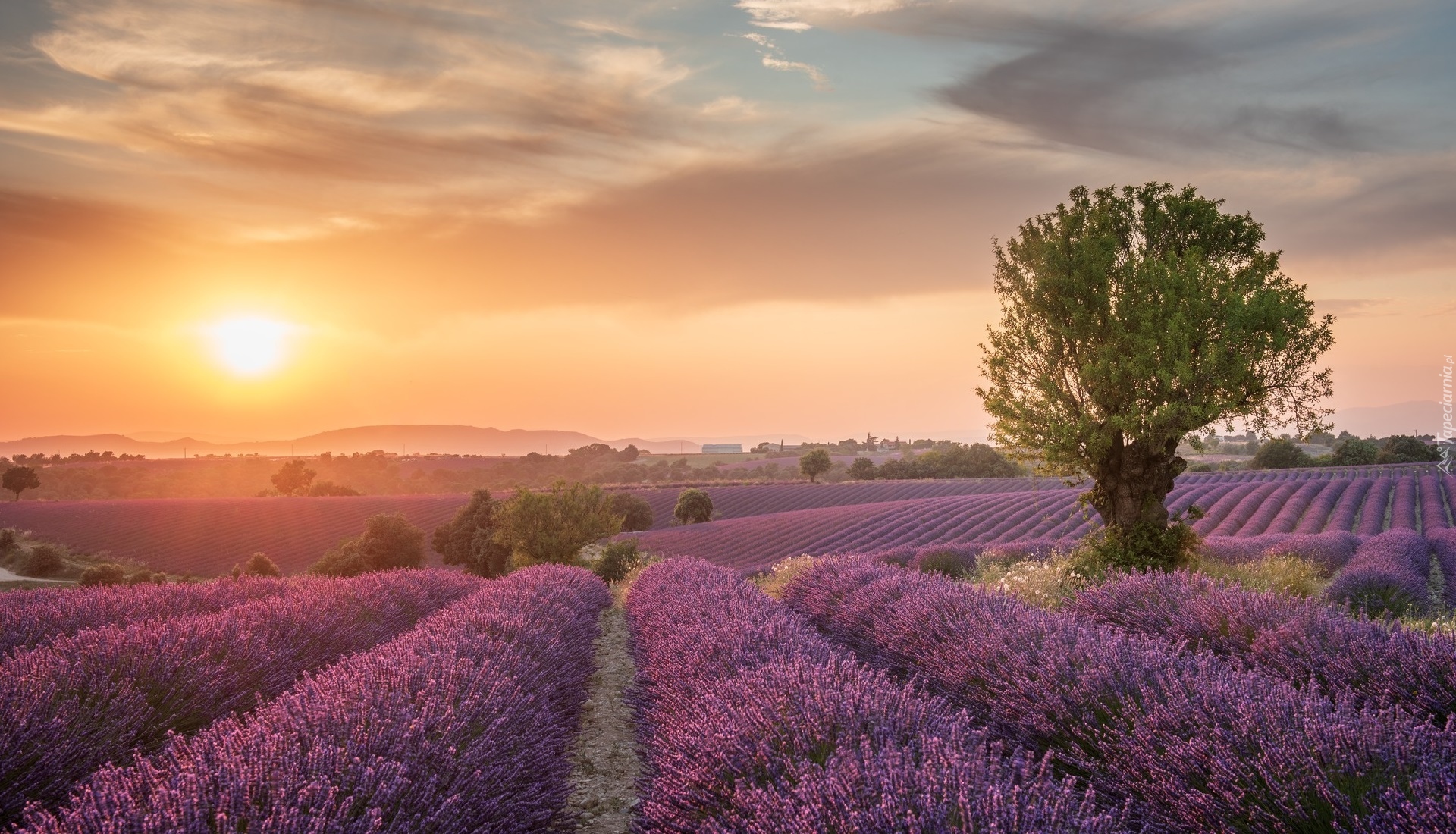 Edytor tapety: Drzewa na polu lawendy w świetle wschodzącego słońca
