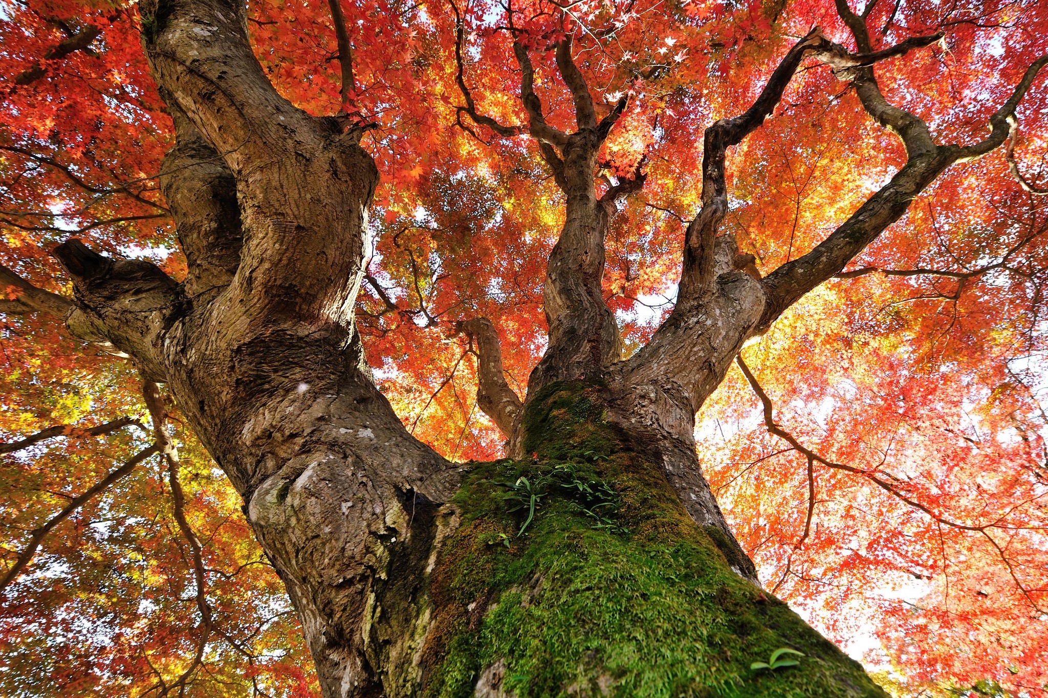 Edytor tapety: Omszały pień i kolorowe jesienne liście na drzewie