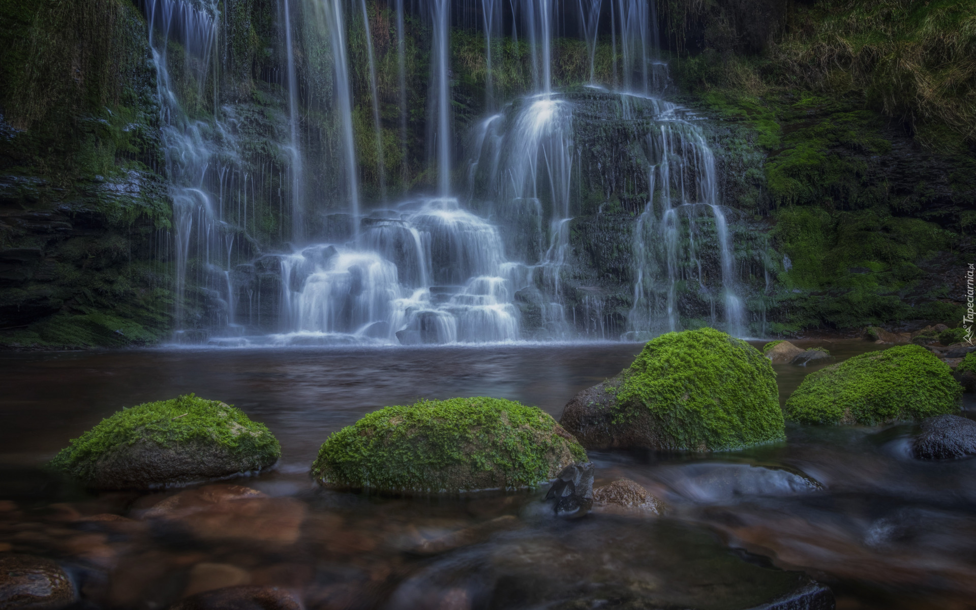 Edytor tapety: Omszałe kamienie i wodospad na skałach