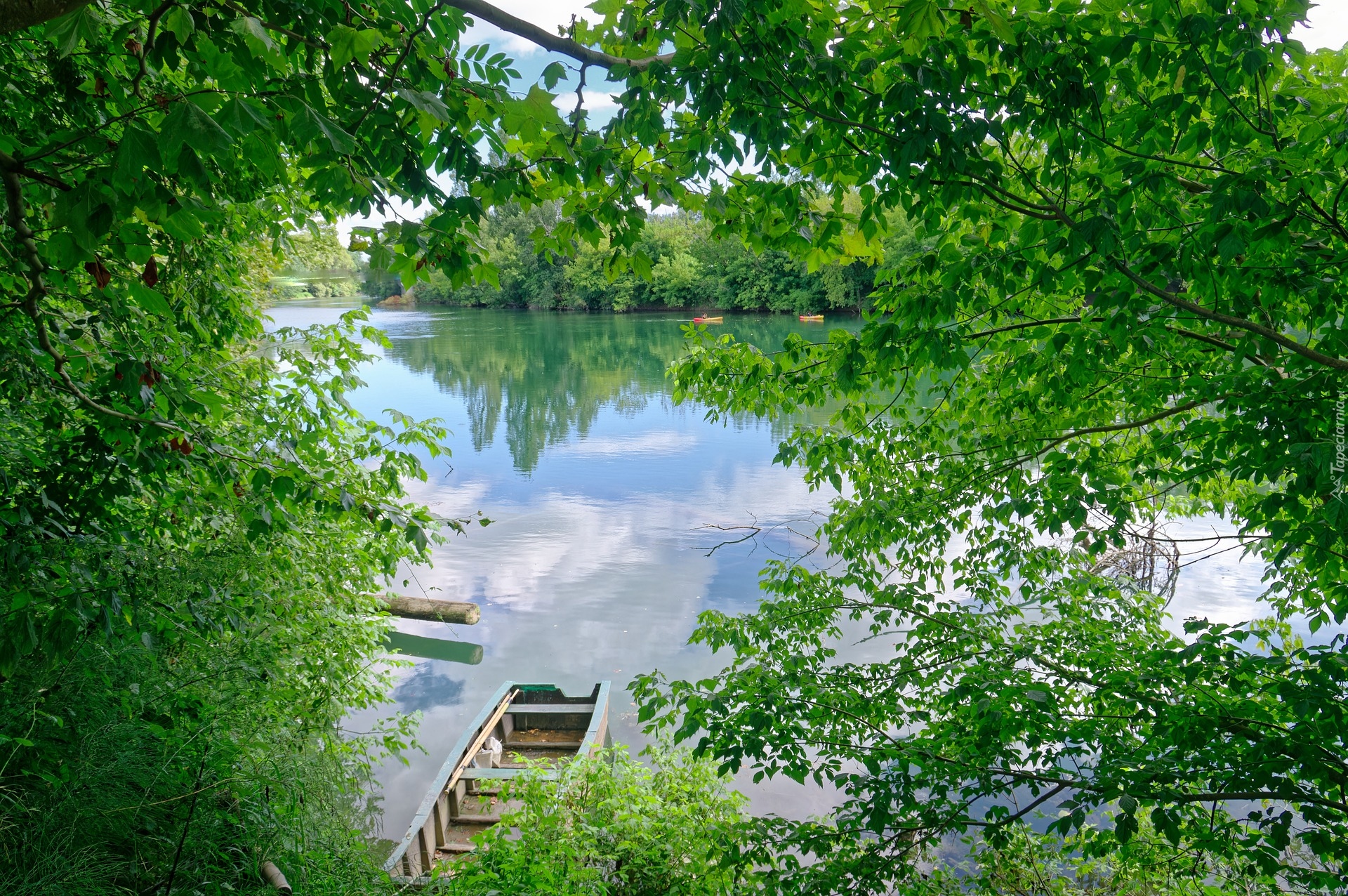 Edytor tapety: Łódka pod zielonymi drzewami na brzegu rzeki