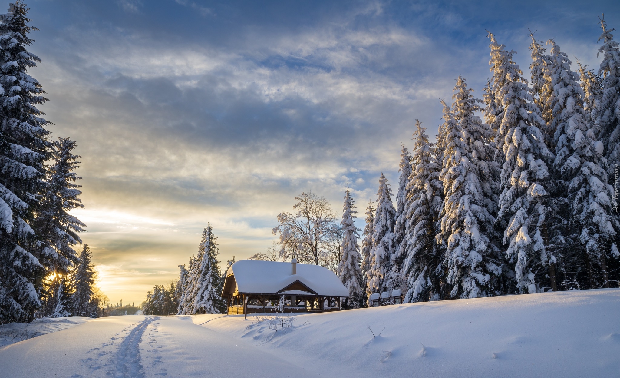 Edytor tapety: Ośnieżone drzewa i dom przy zasypanej śniegiem drodze