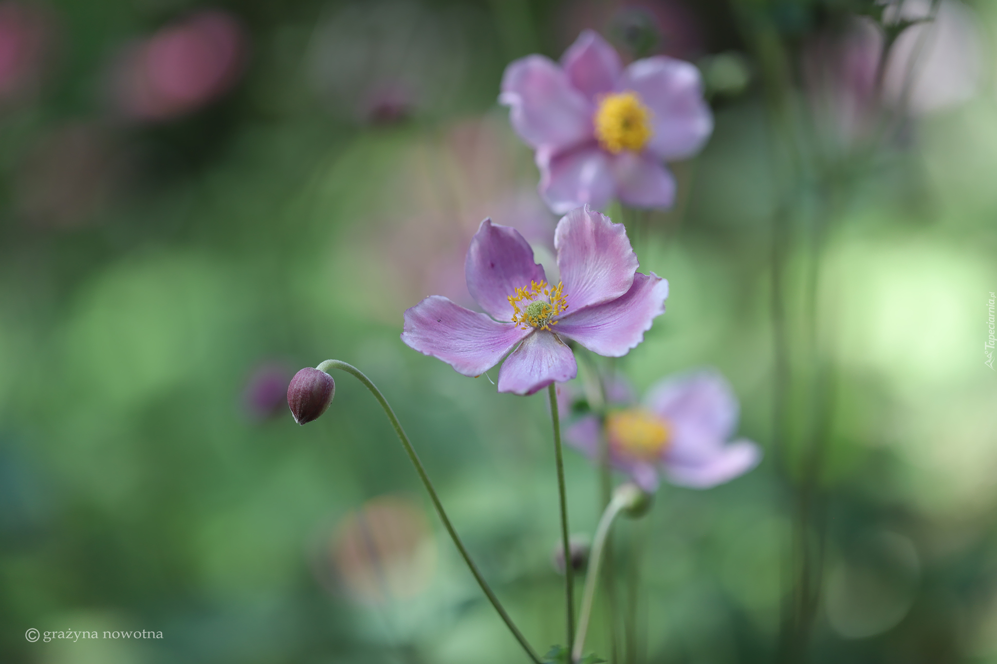 Edytor tapety: Różowy zawilec japoński z pąkami na rozmytym tle