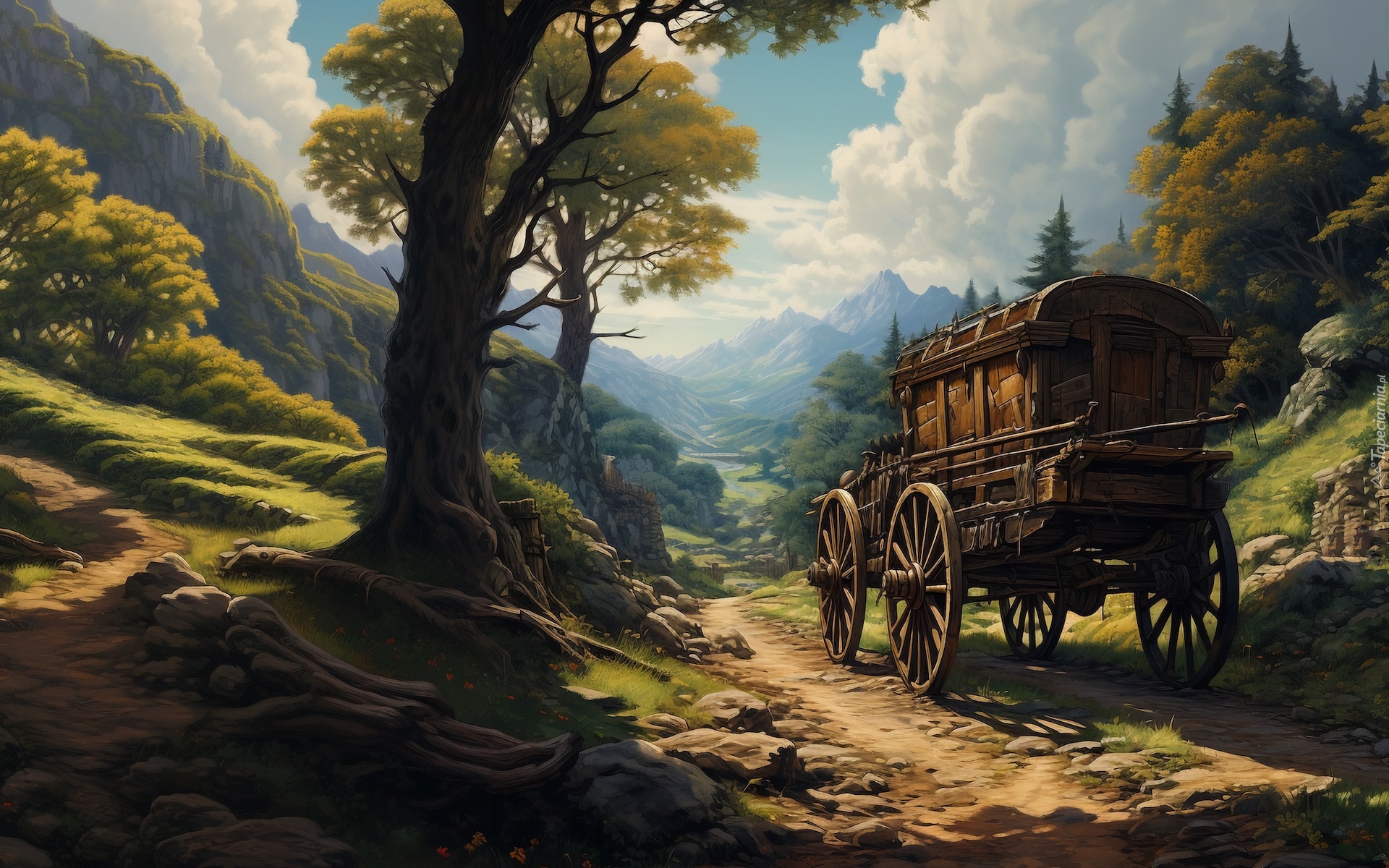 Edytor tapety: Drewniany wóz na kamienistej drodze w 2D