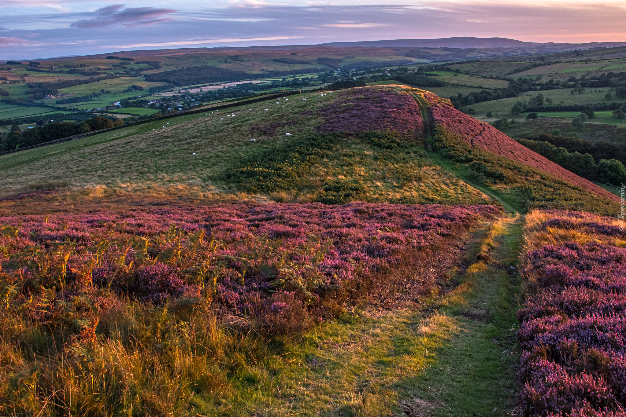 Edytor tapety: Rozświetlone słonecznym blaskiem wrzosowisko na wzgórzu
