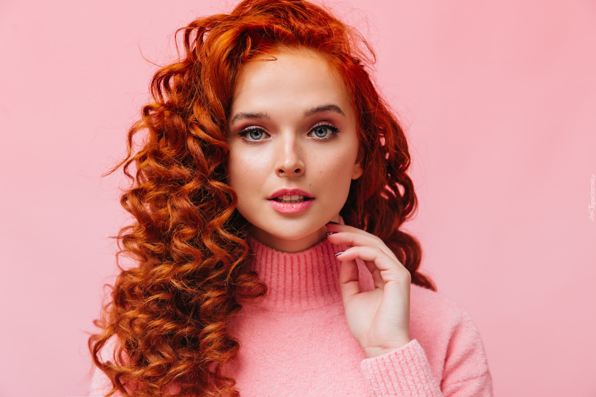 Edytor tapety: Dziewczyna z kręconymi włosami na różowym tle