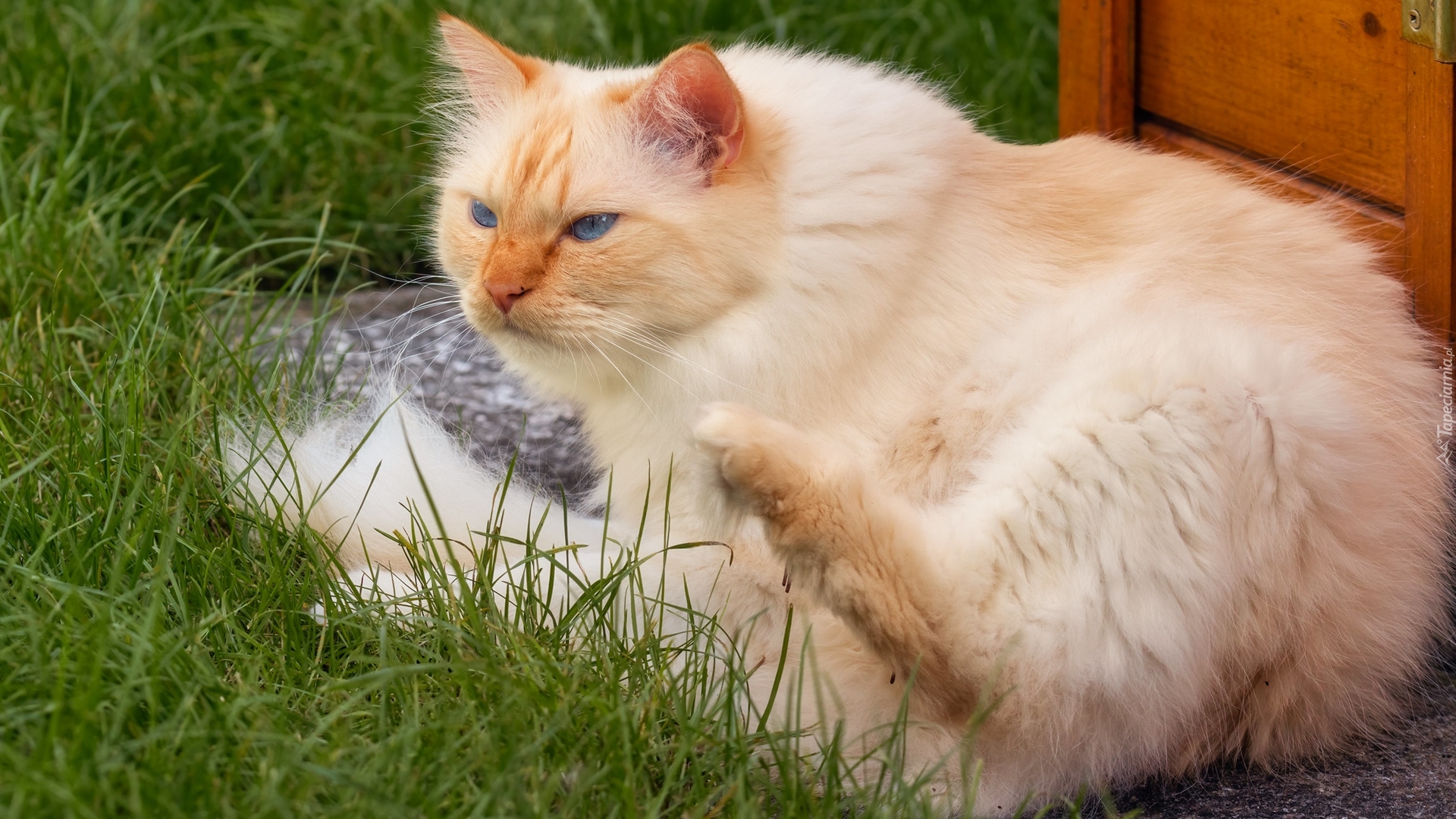 Edytor tapety: Rudawy niebieskooki kot w ogrodzie