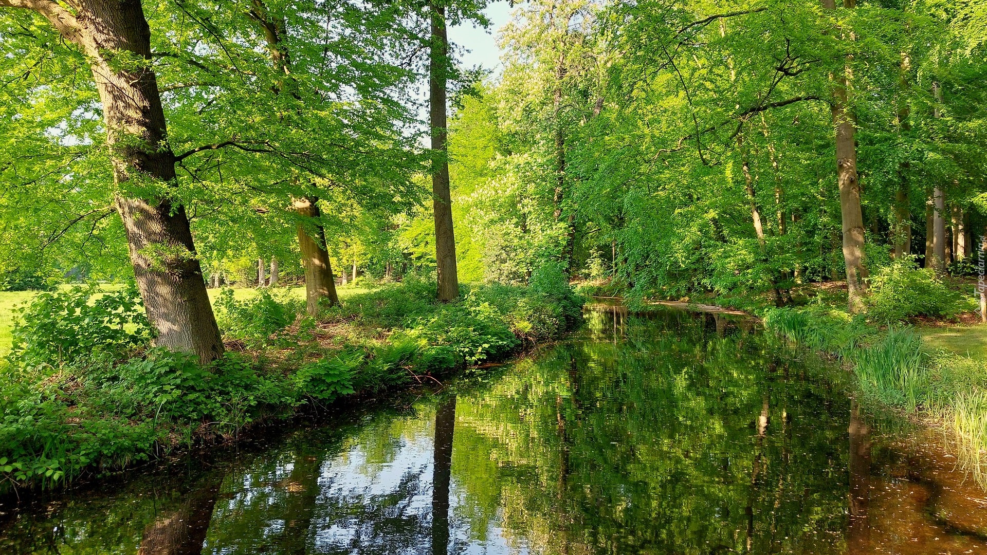 Edytor tapety: Rozświetlone zielone drzewa nad rzeką