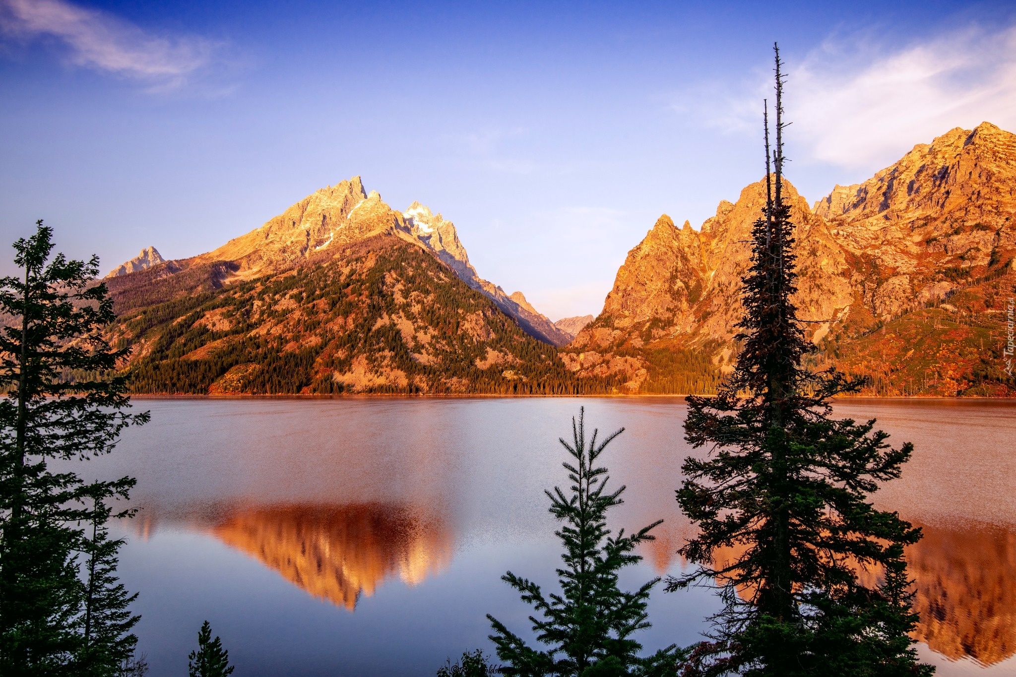 Edytor tapety: Rozświetlone góry Grand Teton nad jeziorem Jenny Lake