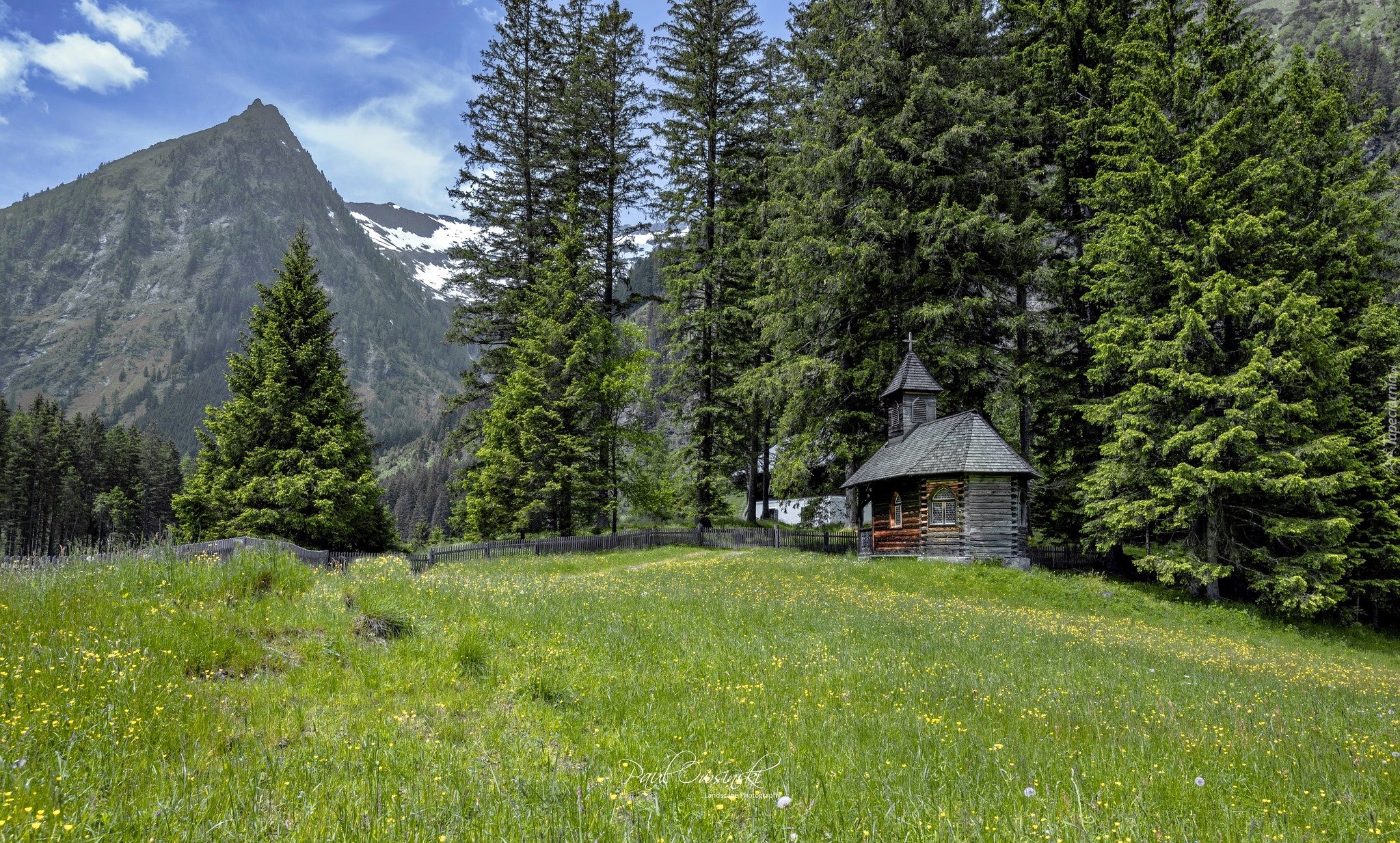 Edytor tapety: Drewniana kapliczka pod drzewami na polanie w górach
