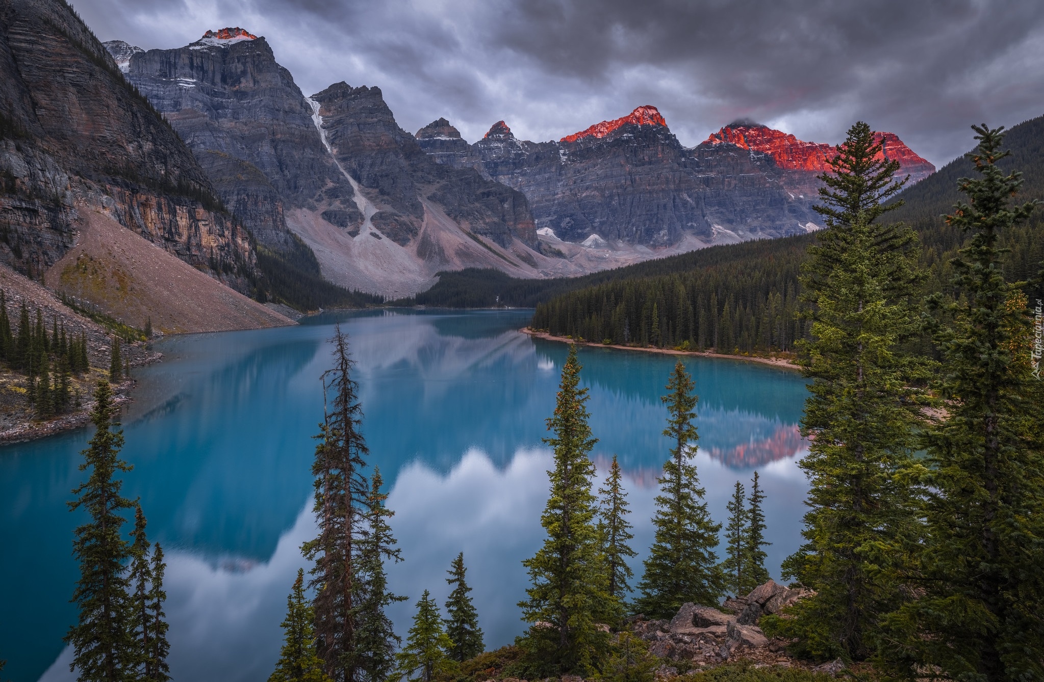Edytor tapety: Ciemne chmury nad górami i jeziorem Moraine