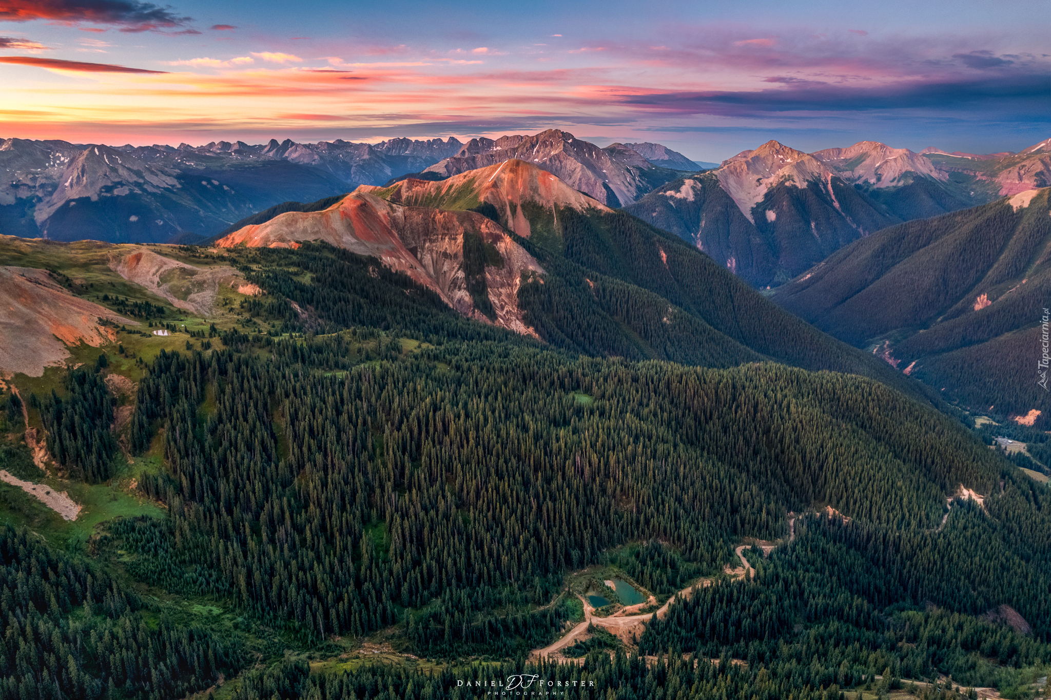 Edytor tapety: Rozświetlone i zalesione góry San Juan w Kolorado