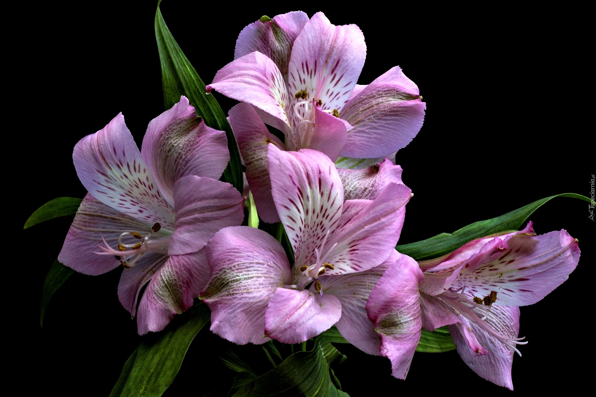 Edytor tapety: Różowe kwiaty alstremerii na czarnym tle