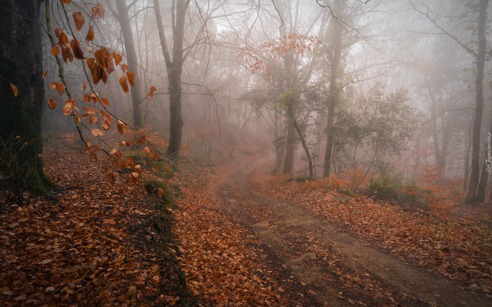 Edytor tapety: Jesienne drzewa przy leśnej drodze w zamglonym lesie