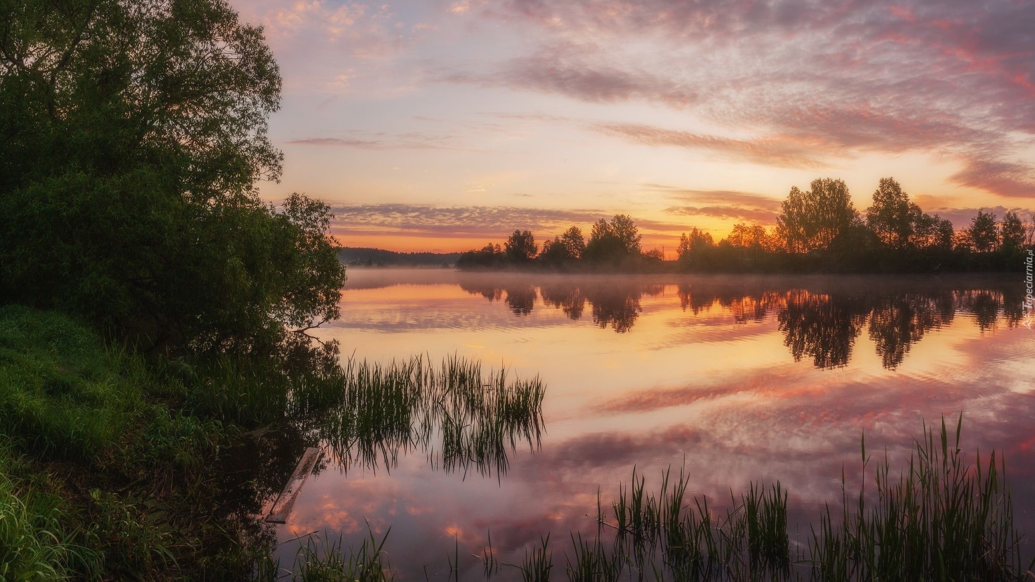 Edytor tapety: Drzewa i szuwary nad jeziorem o zachodzie słońca