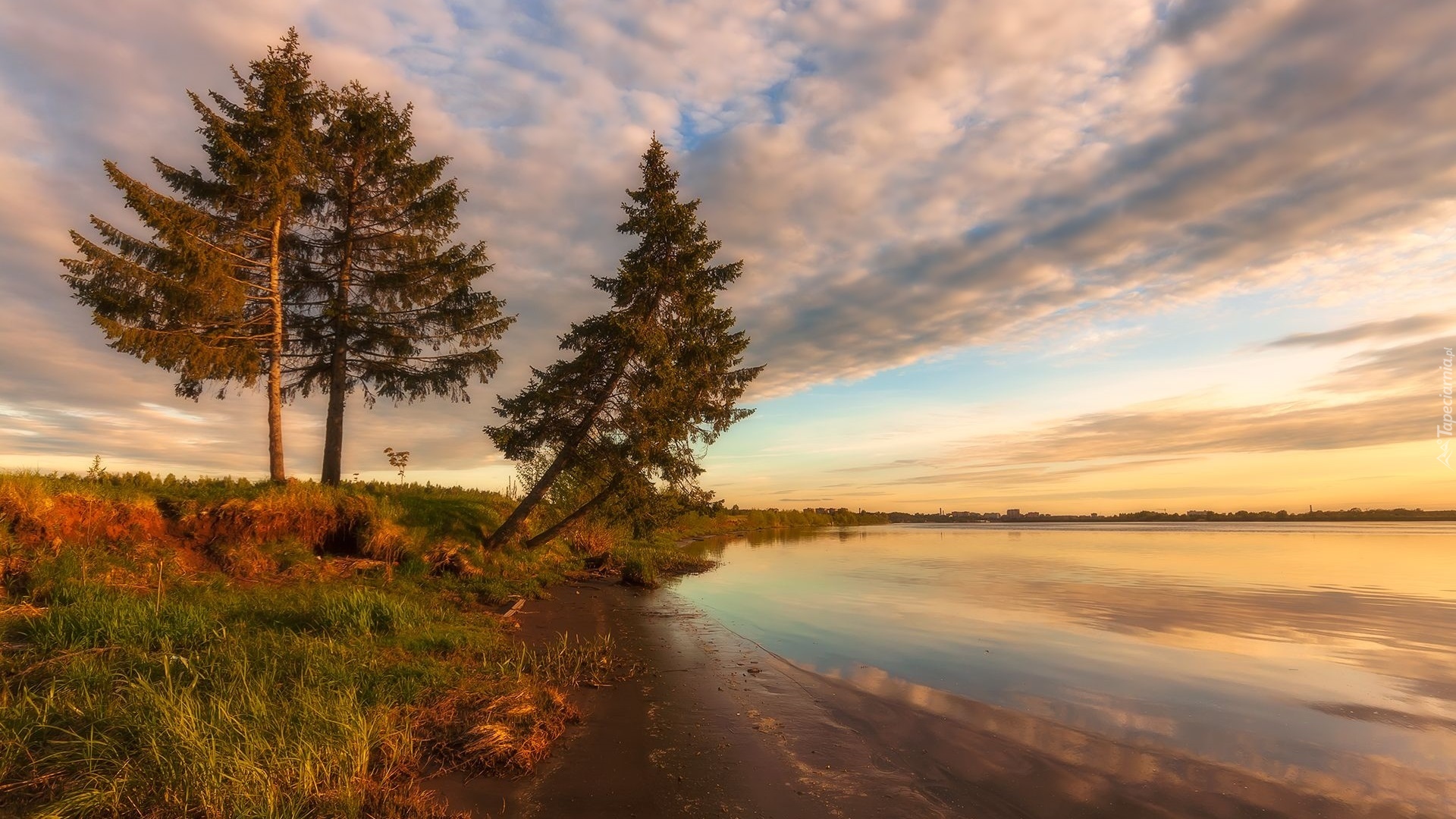 Edytor tapety: Pochyłe sosny na brzegu jeziora