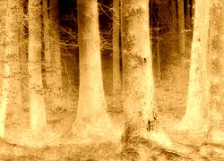 Edytor tapety: Omszałe pnie wysokich drzew w zamglonym jesiennym lesie