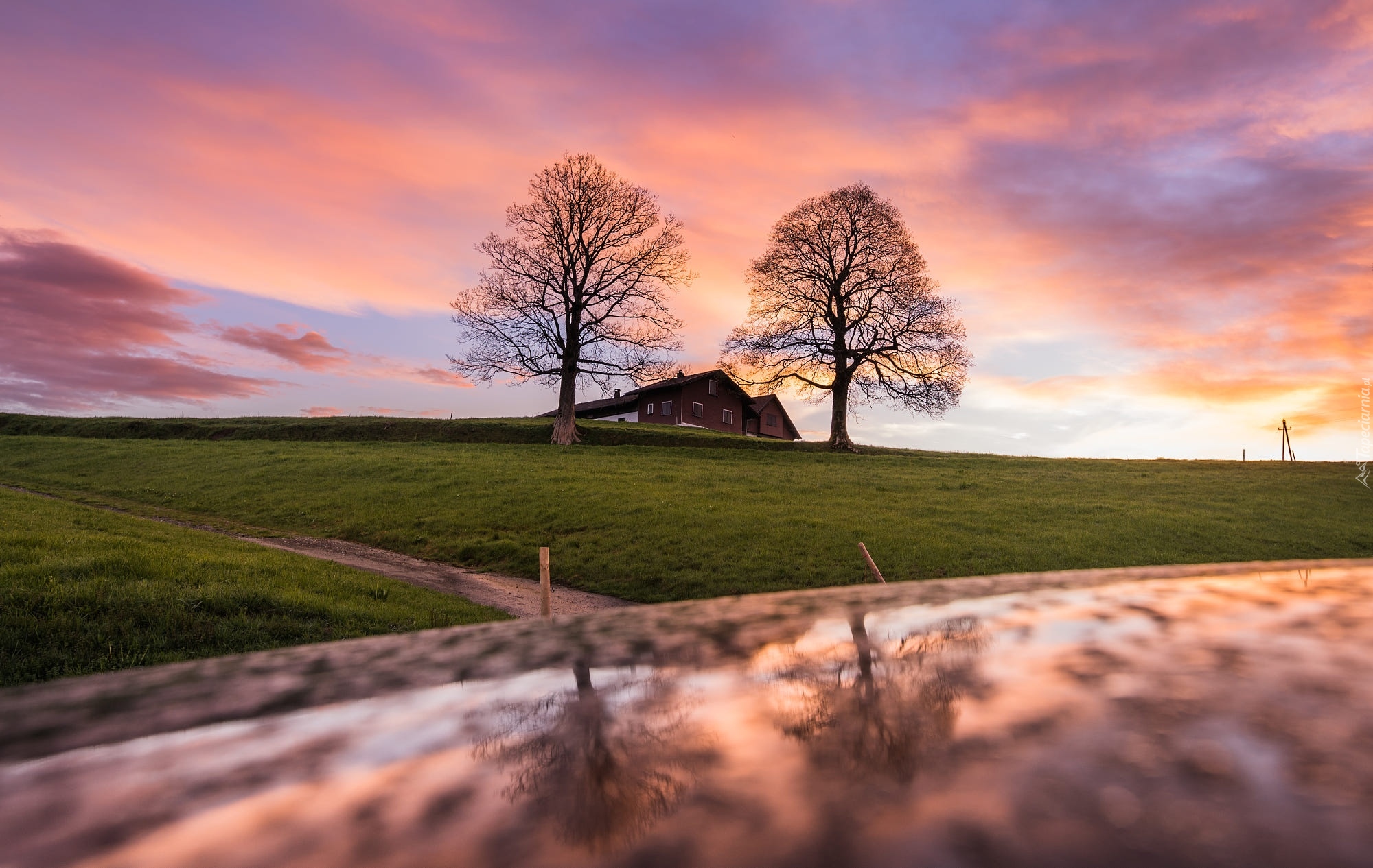Edytor tapety: Dom między drzewami na wzgórzu nad rzeką