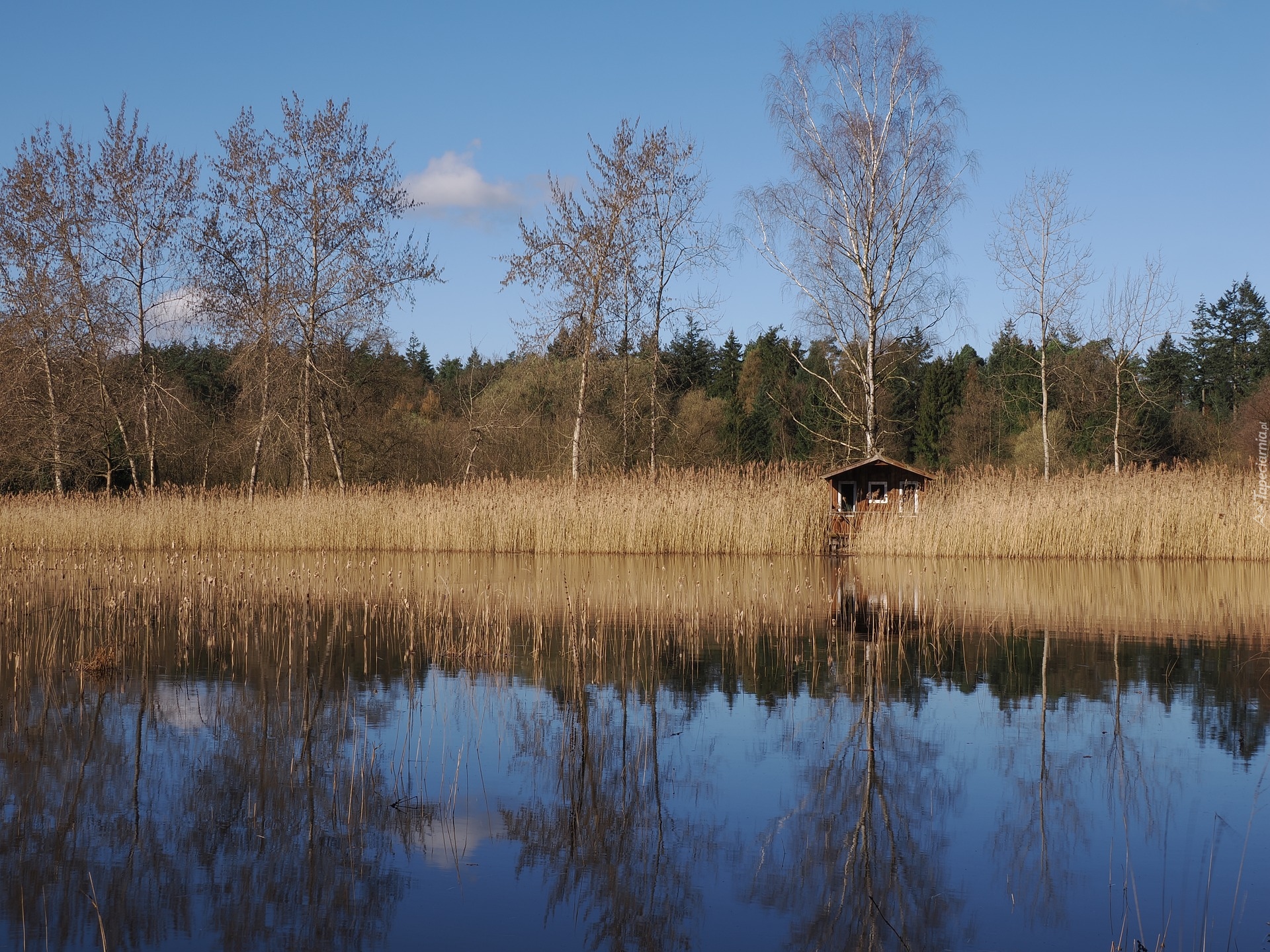 Edytor tapety: Domek w szuwarach nad jeziorem