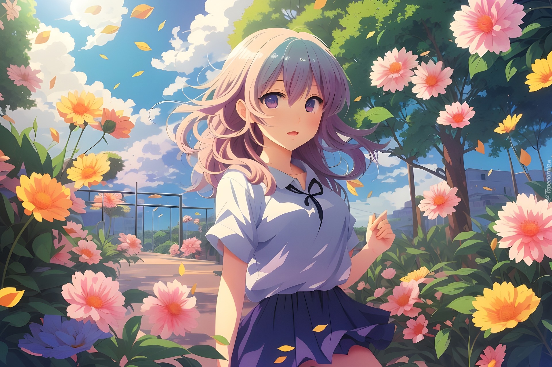 Edytor tapety: Dziewczyna siedząca w ogrodzie wśród kwiatów