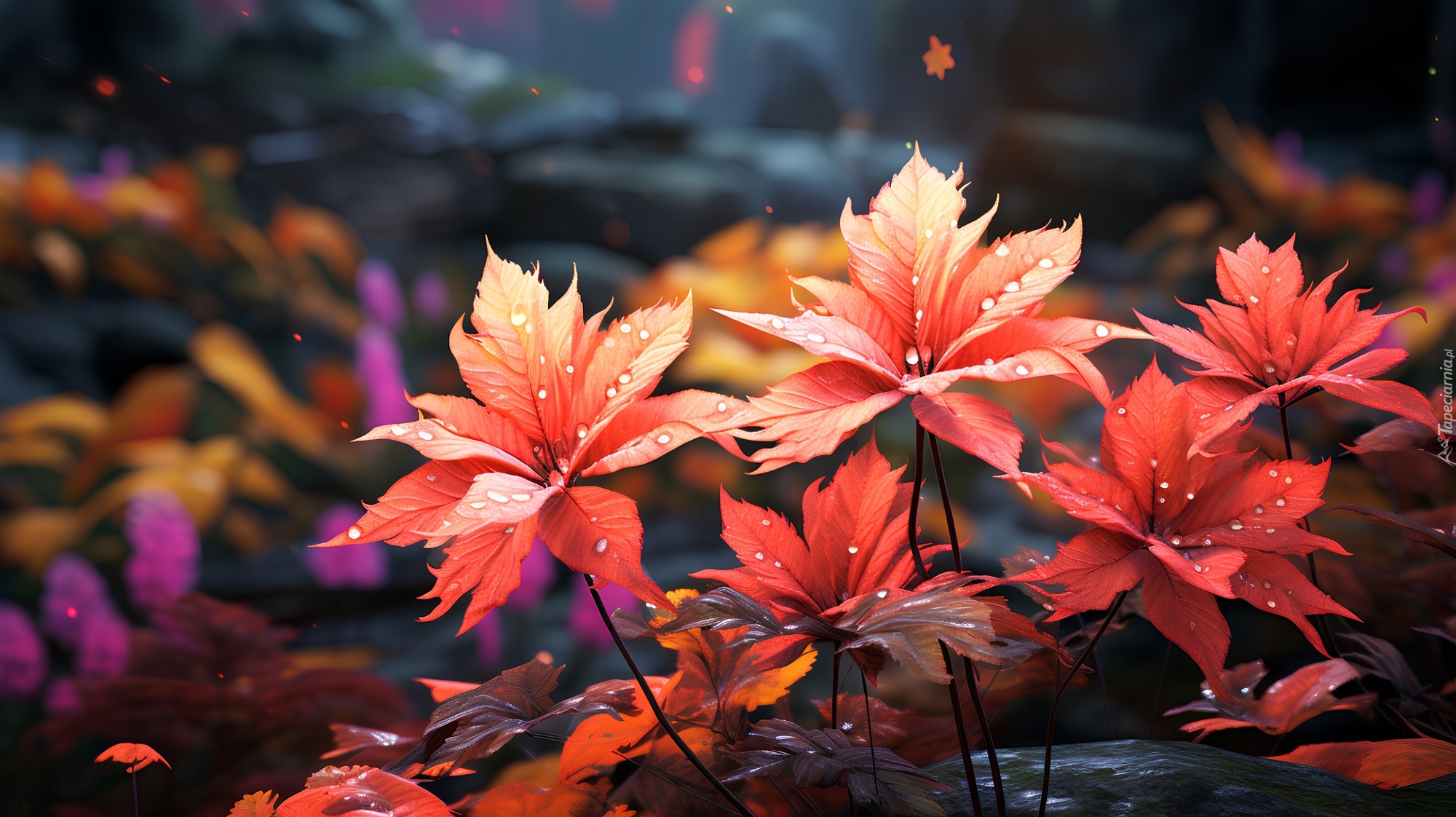 Edytor tapety: Krople na rozświetlonych jesiennych liściach w grafice 2D
