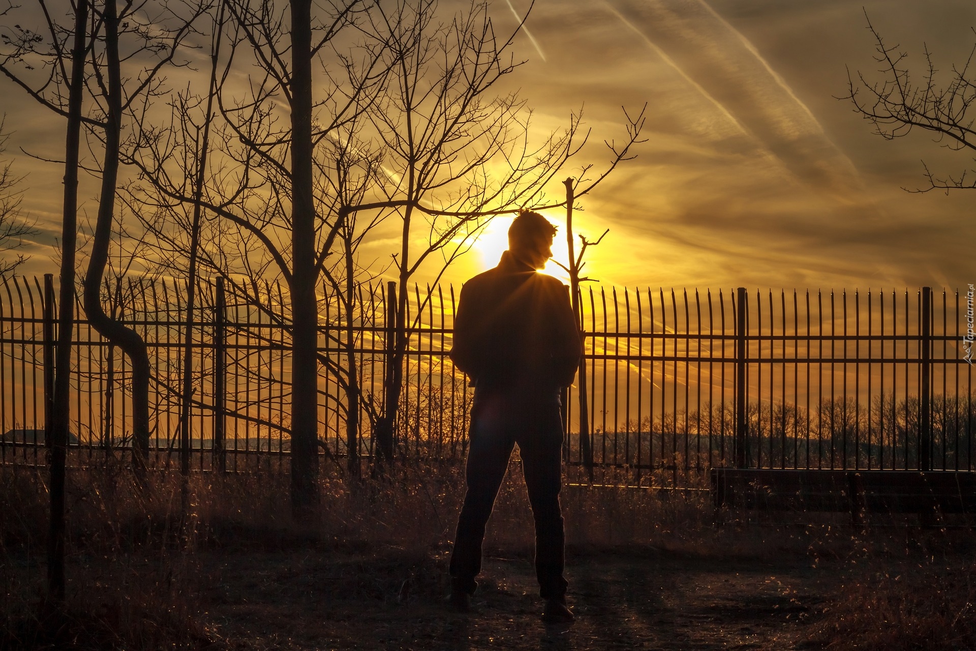 Edytor tapety: Mężczyzna stojący obok płotu na tle zachodzącego słońca
