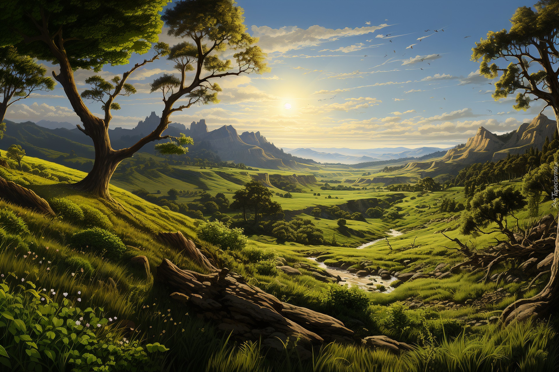 Edytor tapety: Drzewa i strumień w dolinie w 2D