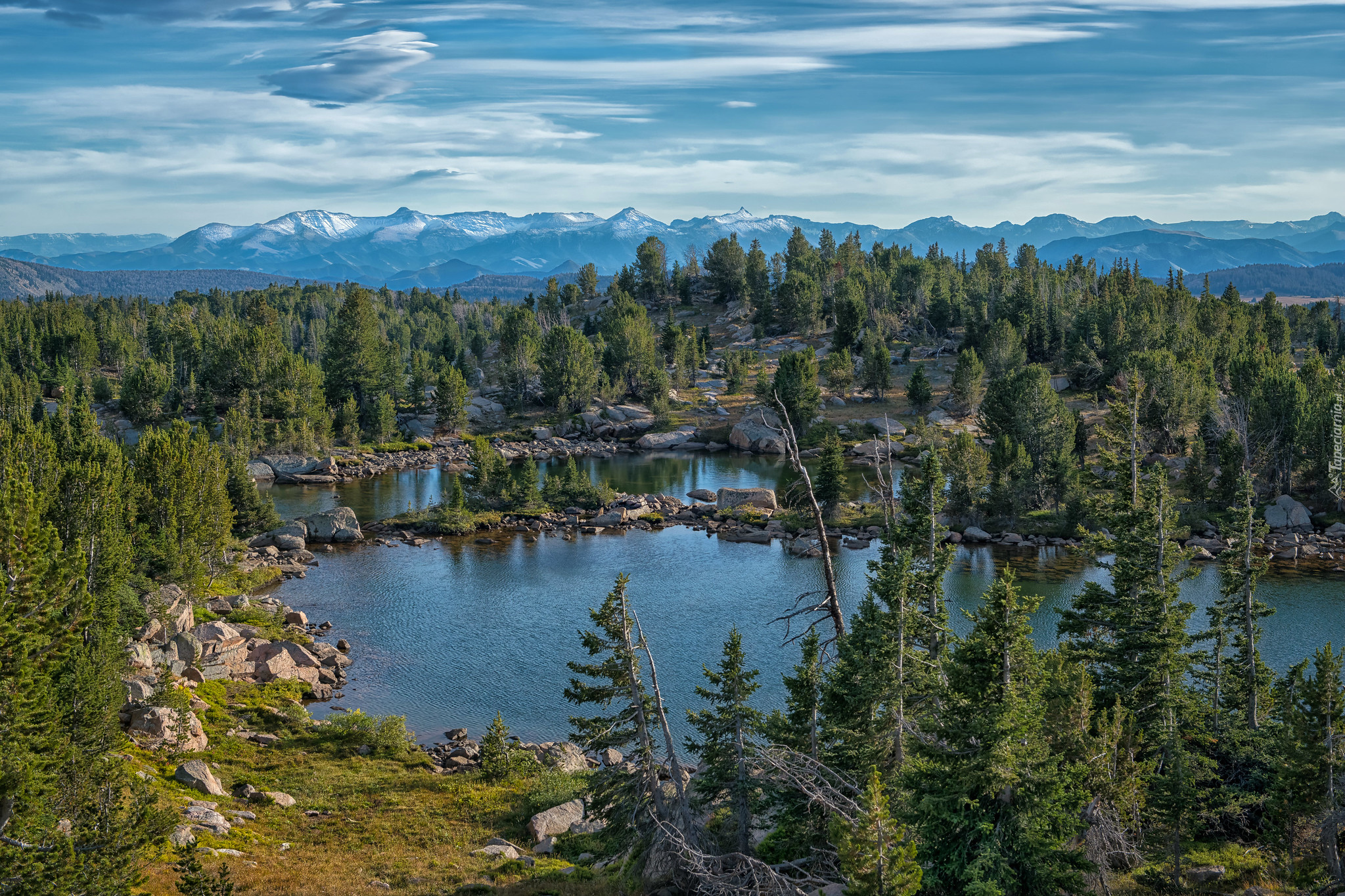 Edytor tapety: Staw w lesie i góry Absaroka w oddali